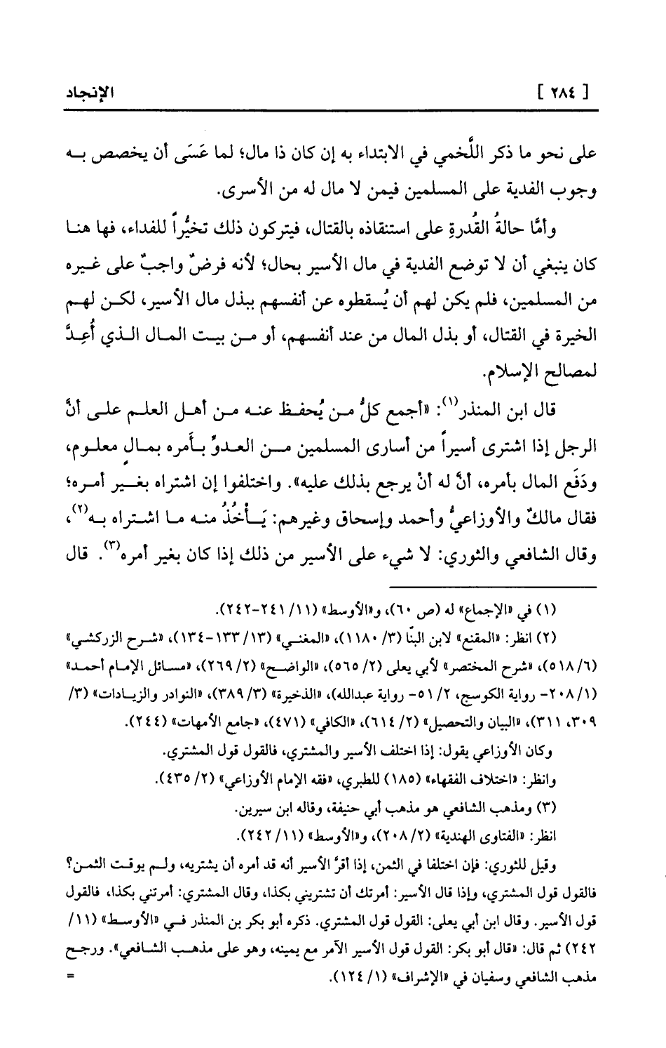 قال ابن المنذر (¬1) : «أجمع كلُّ من يُحفظ عنه من أهل العلم على أنَّ الرجل إذا اشترى أسيراً من أسارى المسلمين من العدوِّ بأَمره بمالٍ معلوم، ودَفَع المال بأمره، أنَّ له أنْ يرجع بذلك عليه» . واختلفوا إن اشتراه بغير أمره؛ فقال مالكٌ والأوزاعيُّ وأحمد وإسحاق وغيرهم: يَأْخُذُ منه ما اشتراه به (¬2) ،