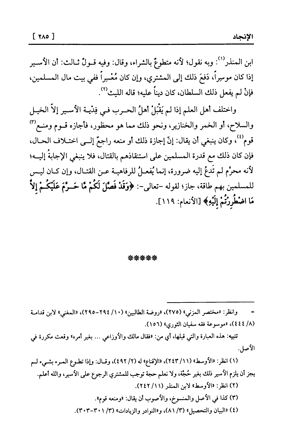 واختلف أهل العلم إذا لم يَقْبَلْ أهلُ الحرب في فِدْية الأسير إلاّ الخيل والسلاح، أو الخمر والخنازير، ونحو ذلك مما هو محظور، فأجازه قوم ومنع (¬3) قوم (¬4) ، وكان ينبغي أن يقال: إنّ إجازة ذلك أو منعه راجعٌ إلى اختلاف الحال، فإن كان ذلك مع قدرة المسلمين على استنقاذهم بالقتال، فلا ينبغي الإجابةُ إليه؛ لأنه محرَّم لم تَدعُ إليه ضرورة، إنما يُفعلُ للرفاهية عن القتال، وإن كان ليس للمسلمين بهم طاقة، جاز؛ لقوله -تعالى-: {وَقَدْ فَصَّلَ لَكُمْ مَّا حَرَّمَ عَلَيْكُمْ إِلاَّ مَا اضْطُرِرْتُمْ إِلَيْهِ} [الأنعام: 119] .