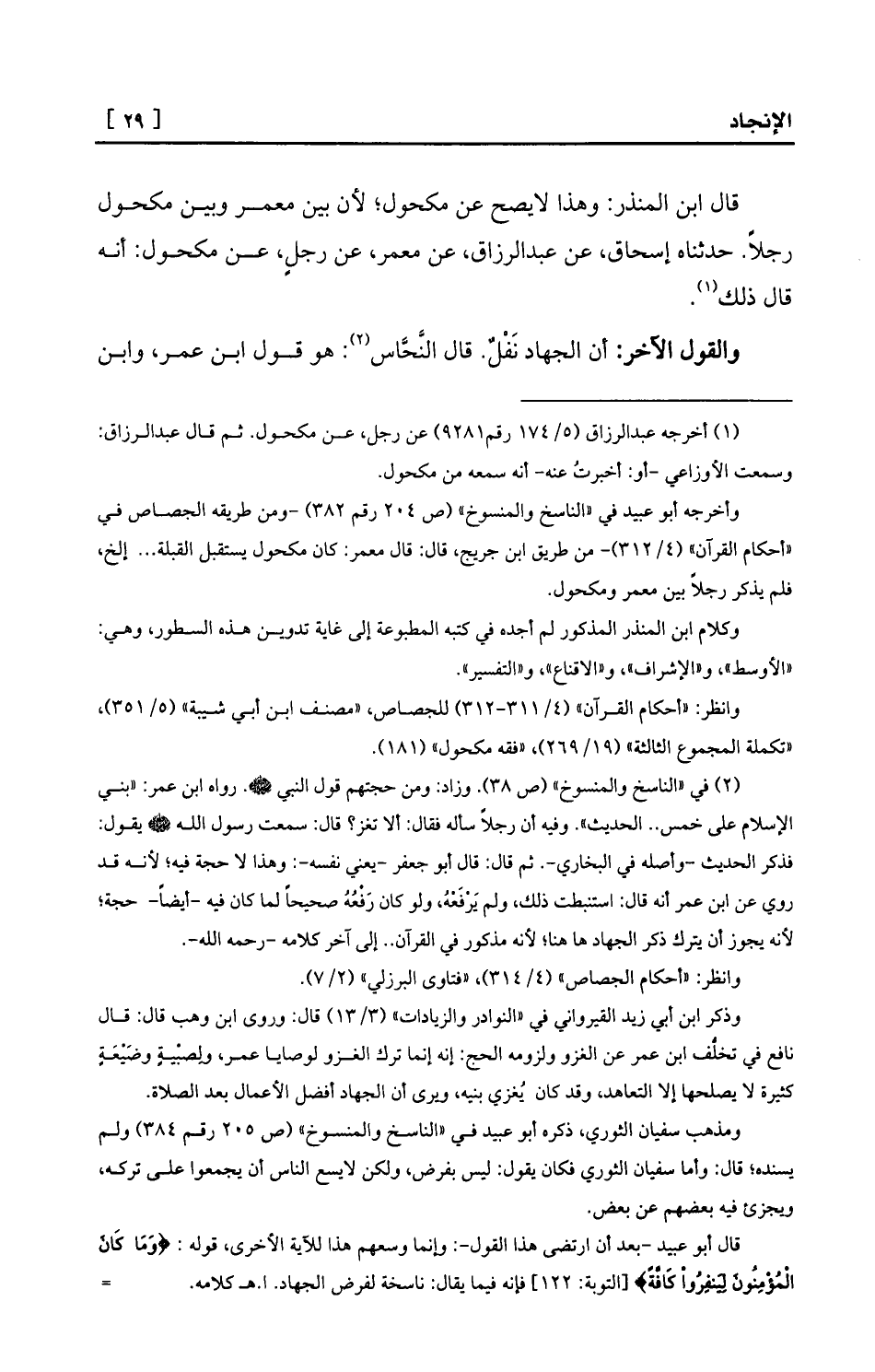 (¬2) في «الناسخ والمنسوخ» (ص 38) . وزاد: ومن حجتهم قول النبي - صلى الله عليه وسلم -. رواه ابن عمر: «بني الإسلام على خمس.. الحديث» . وفيه أن رجلاً سأله فقال: ألا تغز؟ قال: سمعت رسول الله - صلى الله عليه وسلم - يقول: فذكر الحديث -وأصله في البخاري-. ثم قال: قال أبو جعفر -يعني نفسه-: وهذا لا حجة فيه؛ لأنه قد روي عن ابن عمر أنه قال: استنبطت ذلك، ولم يَرْفَعْهُ، ولو كان رَفْعُهُ صحيحاً لما كان فيه -أيضاً- حجة؛ لأنه يجوز أن يترك ذكر الجهاد ها هنا؛ لأنه مذكور في القرآن.. إلى آخر كلامه -رحمه الله-.