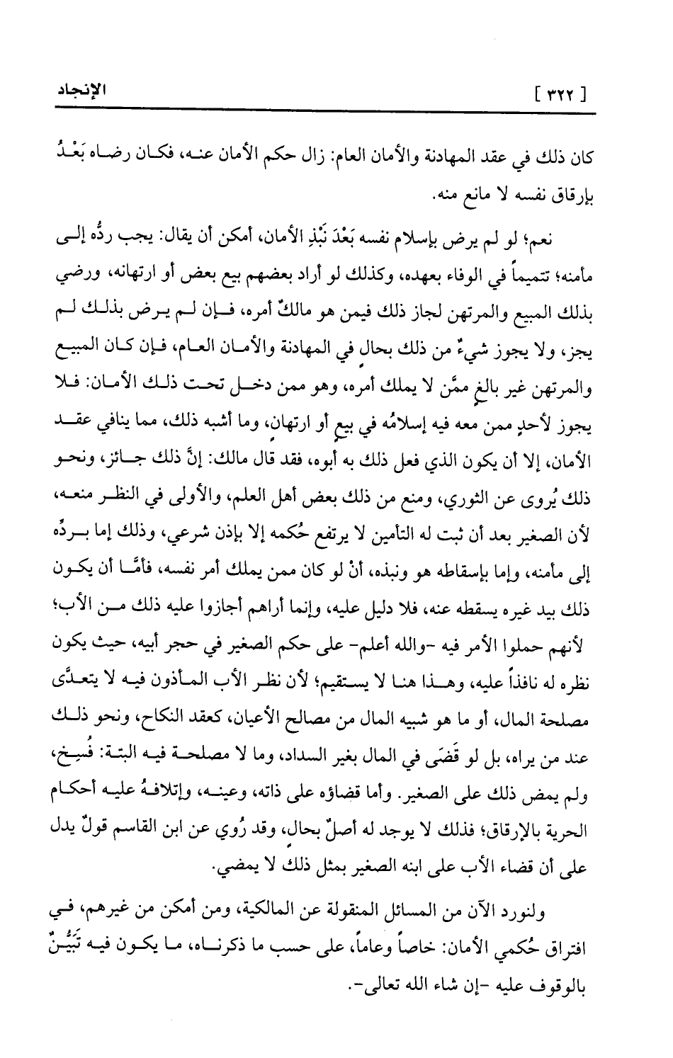 نعم؛ لو لم يرض بإسلام نفسه بَعْدَ نَبْذِ الأمان، أمكن أن يقال: يجب ردُّه إلى مأمنه؛ تتميماً في الوفاء بعهده، وكذلك لو أراد بعضهم بيع بعض أو ارتهانه، ورضي بذلك المبيع والمرتهن لجاز ذلك فيمن هو مالكٌ أمره، فإن لم يرض بذلك لم يجز، ولا يجوز شيءٌ من ذلك بحالٍ في المهادنة والأمان العام، فإن كان المبيع والمرتهن غير بالغٍ ممَّن لا يملك أمره، وهو ممن دخل تحت ذلك الأمان: فلا يجوز لأحدٍ ممن معه فيه إسلامُه في بيعٍ أو ارتهانٍ، وما أشبه ذلك، مما ينافي عقد الأمان، إلا أن يكون الذي فعل ذلك به أبوه، فقد قال مالك: إنَّ ذلك جائز، ونحو ذلك يُروى عن الثوري، ومنع من ذلك بعض أهل العلم، والأولى في النظر منعه، لأن الصغير بعد أن ثبت له التأمين لا يرتفع حُكمه إلا بإذن شرعي، وذلك إما بردِّه إلى