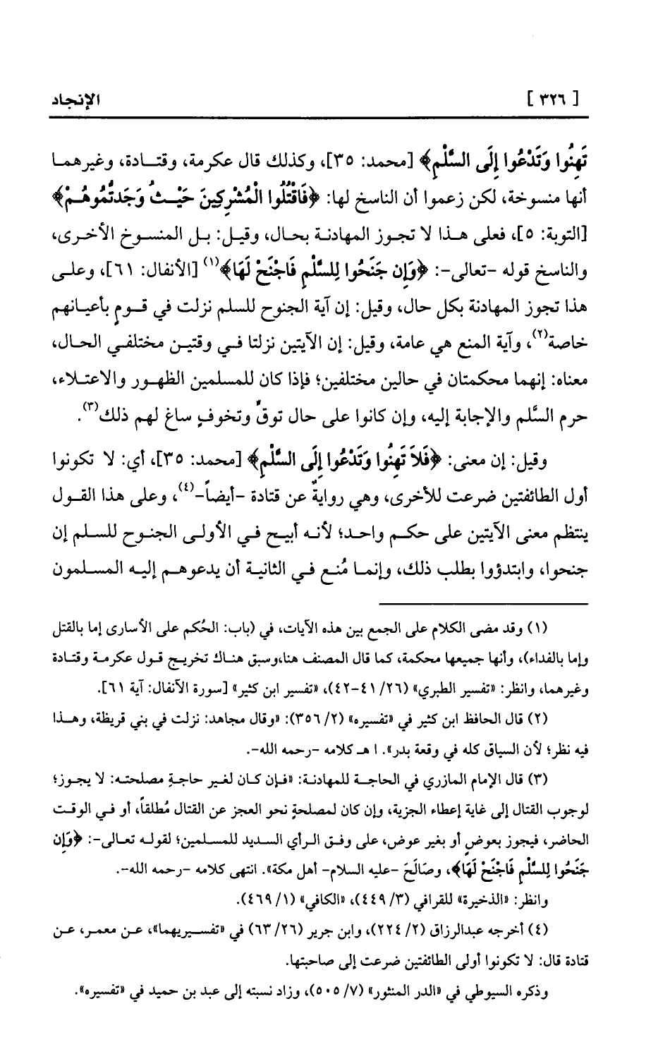 (¬3) قال الإمام المازري في الحاجة للمهادنة: «فإن كان لغير حاجةِ مصلحته: لا يجوز؛ لوجوب القتال إلى غاية إعطاء الجزية، وإن كان لمصلحةٍ نحو العجز عن القتال مُطلقاً، أو في الوقت الحاضر، فيجوز بعوضٍ أو بغير عوض، على وفق الرأي السديد للمسلمين؛ لقوله تعالى-: {وَإِن جَنَحُوا لِلسَّلْمِ فَاجْنَحْ لَهَا} ، وصَالَحَ -عليه السلام- أهل مكة» . انتهى كلامه -رحمه الله-.