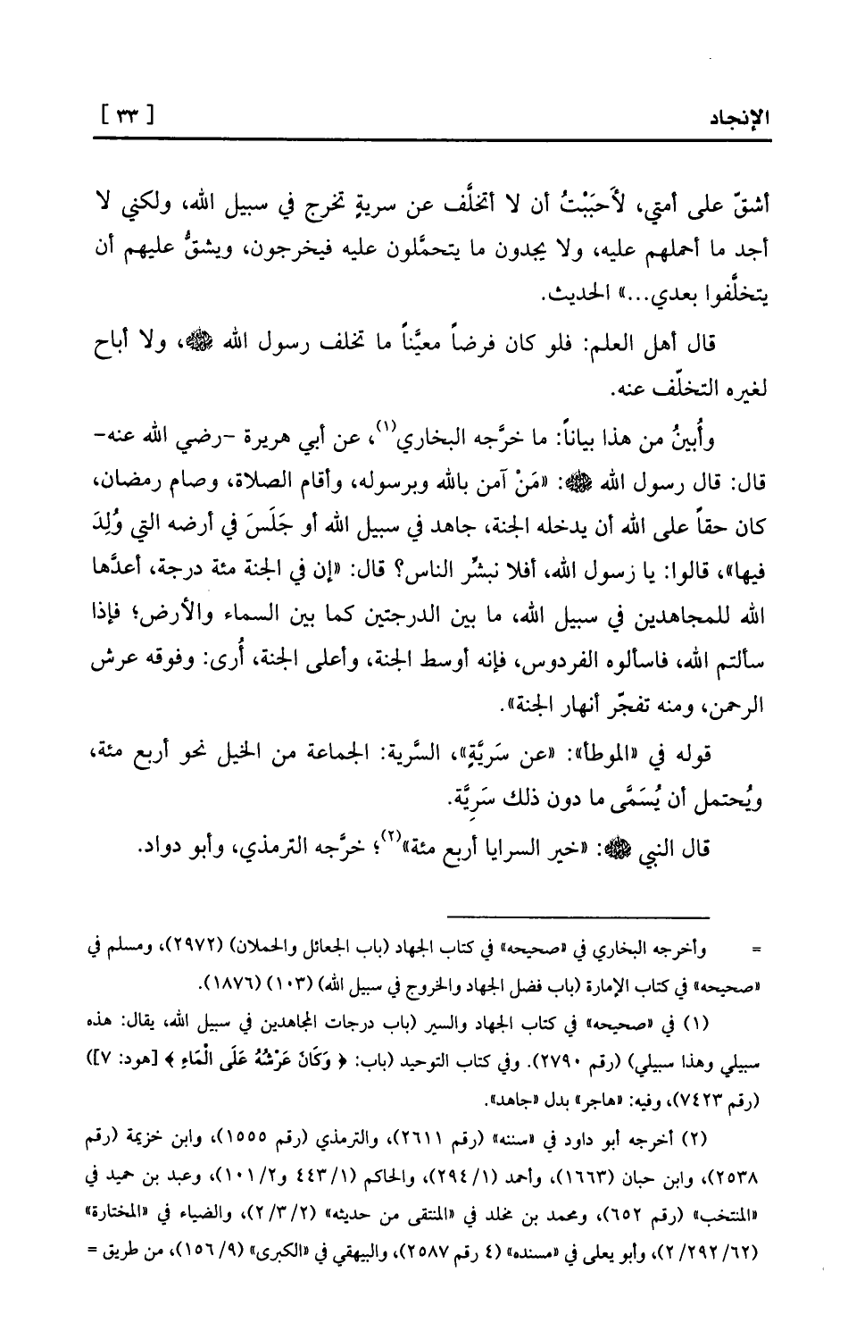 (¬1) في «صحيحه» في كتاب الجهاد والسير (باب درجات المجاهدين في سبيل الله، يقال: هذه سبيلي وهذا سبيلي) (رقم 2790) . وفي كتاب التوحيد (باب: {وَكَانَ عَرْشُهُ عَلَى الْمَاءِ} [هود: 7] ) (رقم 7423) ، وفيه: «هاجر» بدل «جاهد» .