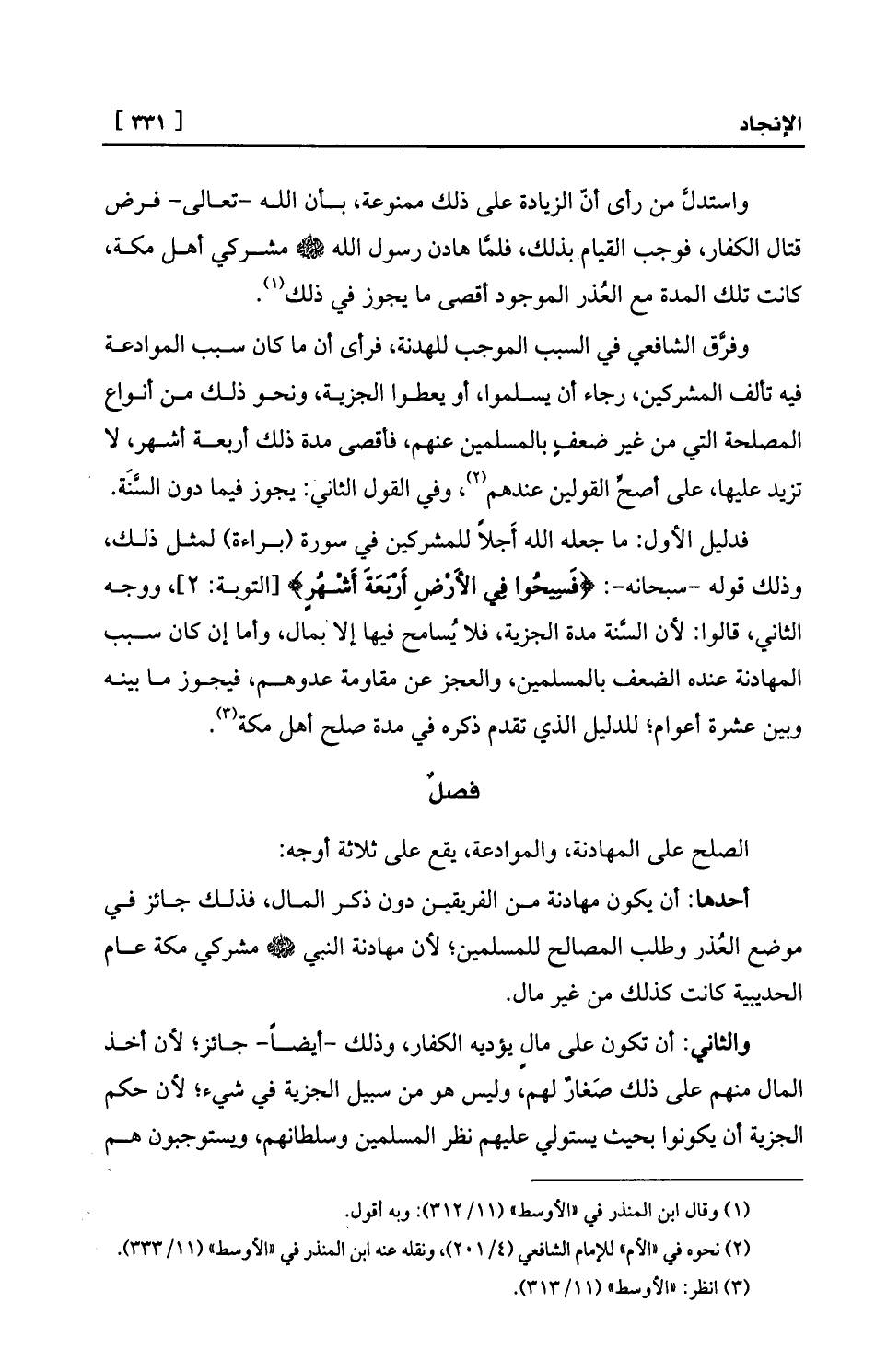 وفرَّق الشافعي في السبب الموجب للهدنة، فرأى أن ما كان سبب الموادعة فيه تألف المشركين، رجاء أن يسلموا، أو يعطوا الجزية، ونحو ذلك من أنواع المصلحة التي من غير ضعفٍ بالمسلمين عنهم، فأقصى مدة ذلك أربعة أشهر، لا تزيد عليها، على أصحِّ القولين عندهم (¬2) ، وفي القول الثاني: يجوز فيما دون السَّنَة.