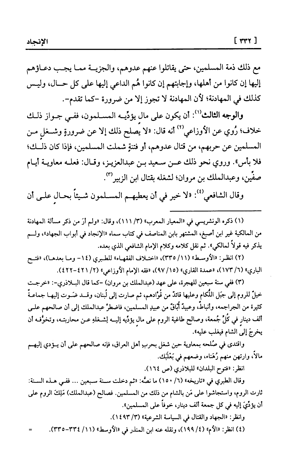 (¬1) ذكره الونشريسي في «المعيار المعرب» (3/111) ، وقال: «ولم أرَ من ذكر مسألة المهادنة من المالكية غير ابن أصبغ، المشتهر بابن المناصف في كتاب سماه «الإنجاد في أبواب الجهاد» ، ولم يذكر فيه قولاً لمالكي» . ثم نقل كلامه وكلام الإمام الشافعي الذي بعده.