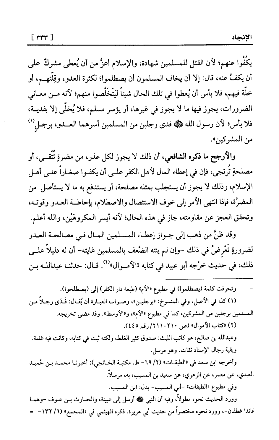 وقد ظنَّ من ذهب إلى جواز إعطاء المسلمين المال في مصالحة العدو لضرورةٍ تَعْرِضُ في ذلك -وإن لم ينته الضَّعف بالمسلمين غايته- أن له دليلاً على ذلك، في حديث خرَّجه أبو عبيد في كتابه «الأموال» (¬2) . قال: حدثنا عبد الله بن