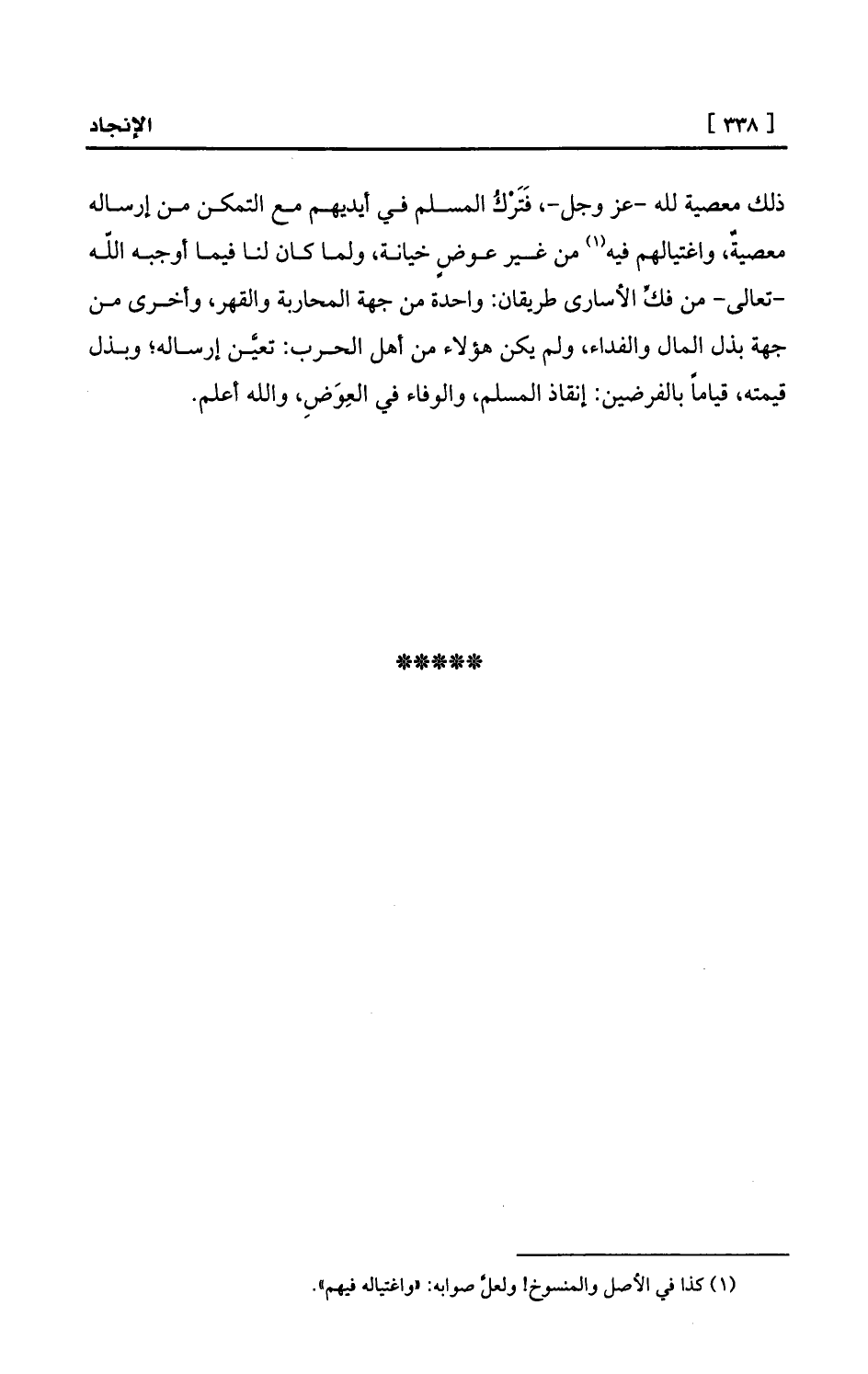 ذلك معصية لله -عز وجل-، فَتَرْكُ المسلم في أيديهم مع التمكن من إرساله معصيةٌ، واغتيالهم فيه (¬1) من غير عوضٍ خيانة، ولما كان لنا فيما أوجبه الله