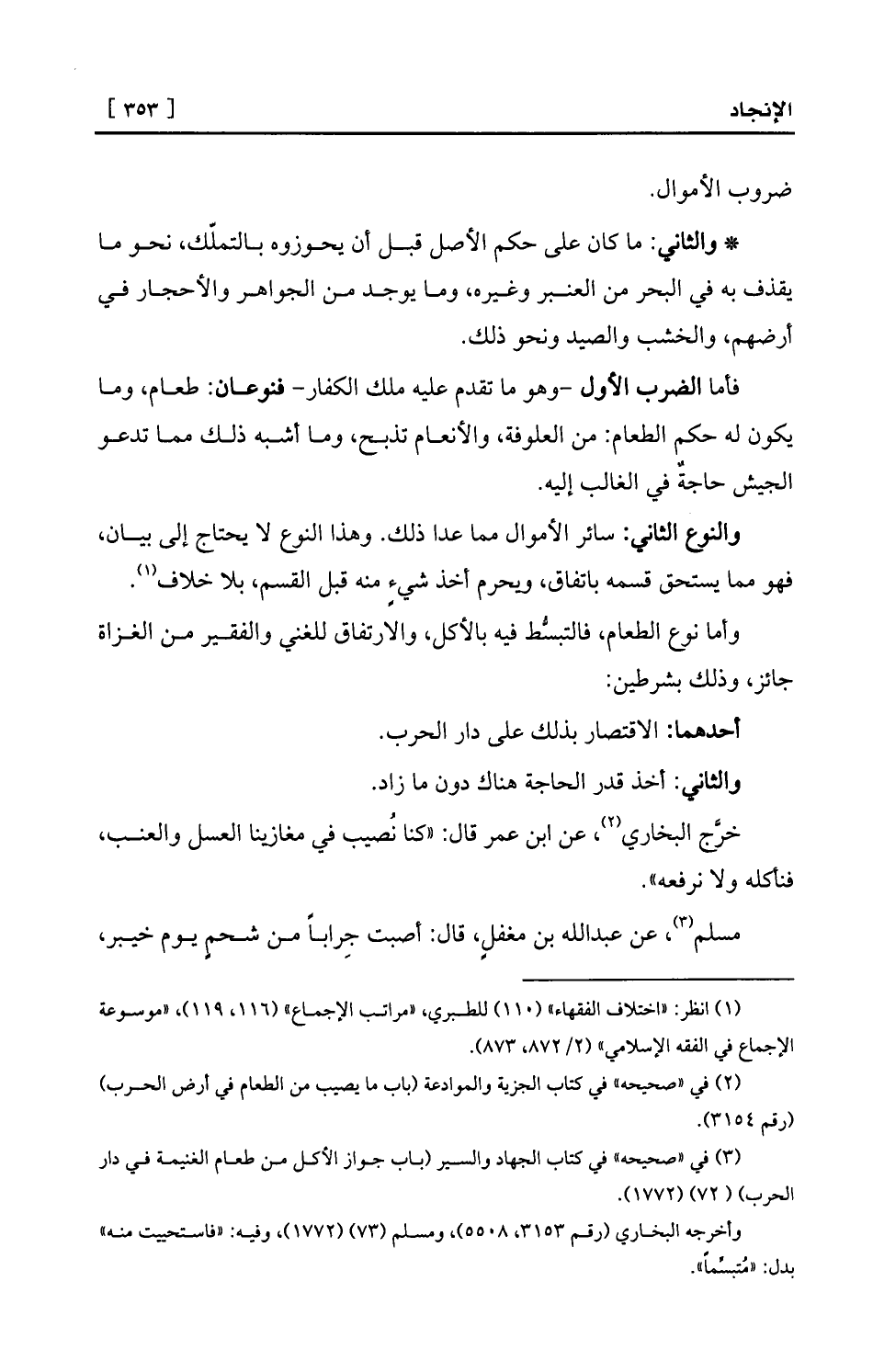 فأما الضرب الأول -وهو ما تقدم عليه ملك الكفار- فنوعان: طعام، وما يكون له حكم الطعام: من العلوفة، والأنعام تذبح، وما أشبه ذلك مما تدعو الجيش حاجةٌ في الغالب إليه.