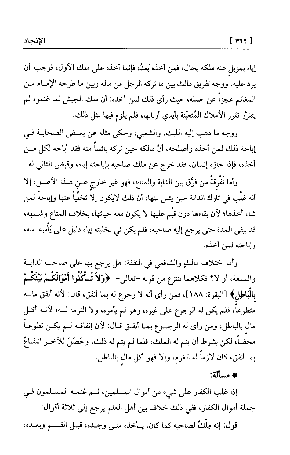 إياه بمزيلٍ عنه ملكه بحال، فمن أخذه بَعدُ، فإنما أخذه على ملك الأول، فوجب أن يرد عليه. ووجه تفريق مالك بين ما تركه الرجل من ماله وبين ما طرحه الإمام من المغانم عجزاً عن حمله، حيث رأى ذلك لمن أخذه: أن ملك الجيش لما غنموه لم يتقرَّر تقرر الأملاك المُتعيّنة بأيدي أربابها، فلم يلزم فيها مثل ذلك.