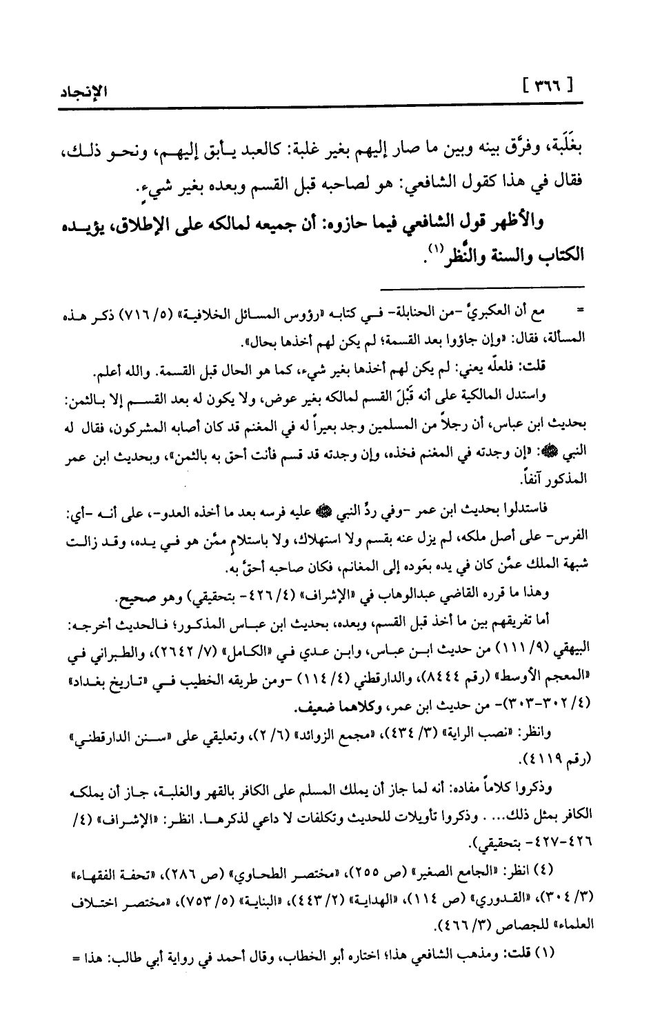 واستدل المالكية على أنه قَبْلَ القسم لمالكه بغير عوض، ولا يكون له بعد القسم إلا بالثمن: بحديث ابن عباس، أن رجلاً من المسلمين وجد بعيراً له في المغنم قد كان أصابه المشركون، فقال له النبي - صلى الله عليه وسلم -: «إن وجدته في المغنم فخذه، وإن وجدته قد قسم فأنت أحق به بالثمن» ، وبحديث ابن عمر المذكور آنفاً.