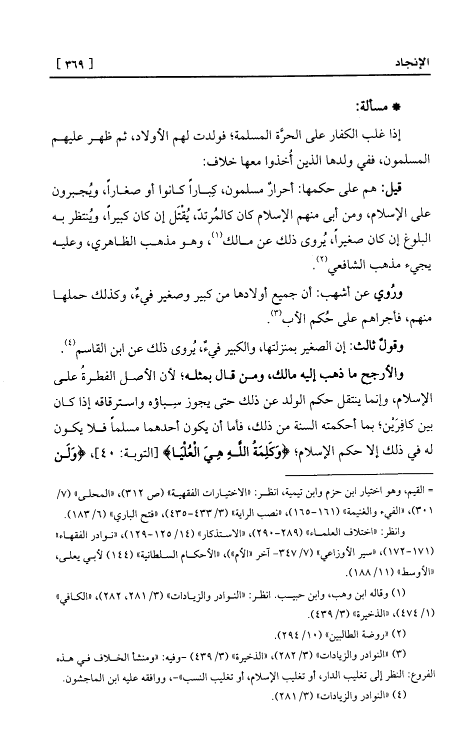 (¬3) «النوادر والزيادات» (3/282) ، «الذخيرة» (3/439) -وفيه: «ومنشأ الخلاف في هذه الفروع: النظر إلى تغليب الدار، أو تغليب الإسلام، أو تغليب النسب» -، ووافقه عليه ابن الماجشون.