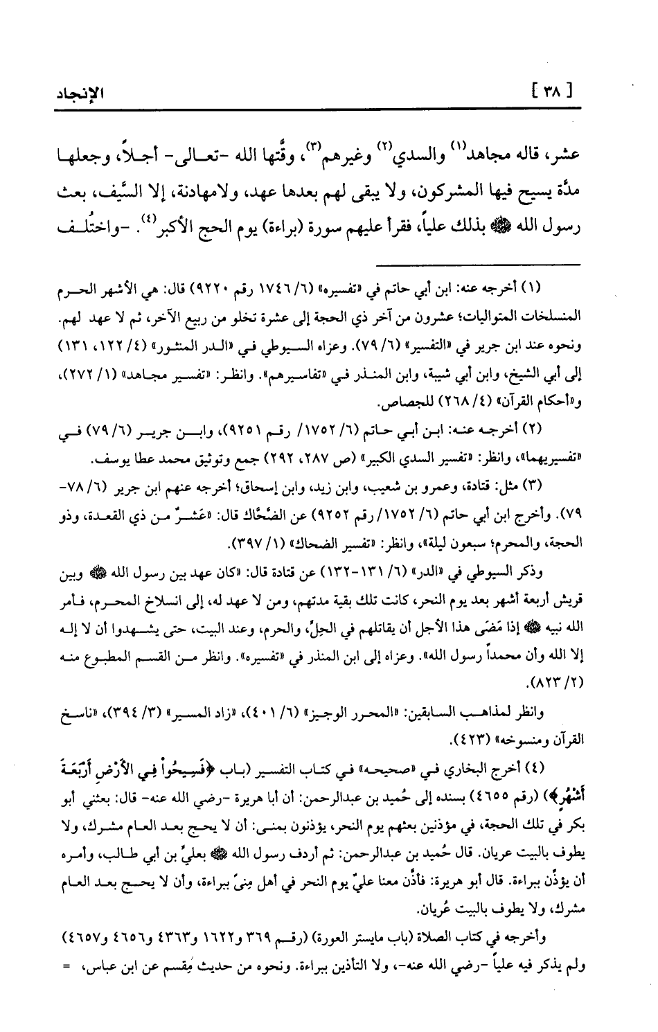 (¬1) أخرجه عنه: ابن أبي حاتم في «تفسيره» (6/1746 رقم 9220) قال: هي الأشهر الحرم المنسلخات المتواليات؛ عشرون من آخر ذي الحجة إلى عشرة تخلو من ربيع الآخر، ثم لا عهد لهم. ونحوه عند ابن جرير في «التفسير» (6/79) . وعزاه السيوطي في «الدر المنثور» (4/122، 131) إلى أبي الشيخ، وابن أبي شيبة، وابن المنذر في «تفاسيرهم» . وانظر: «تفسير مجاهد» (1/272) ، و «أحكام القرآن» (4/268) للجصاص.