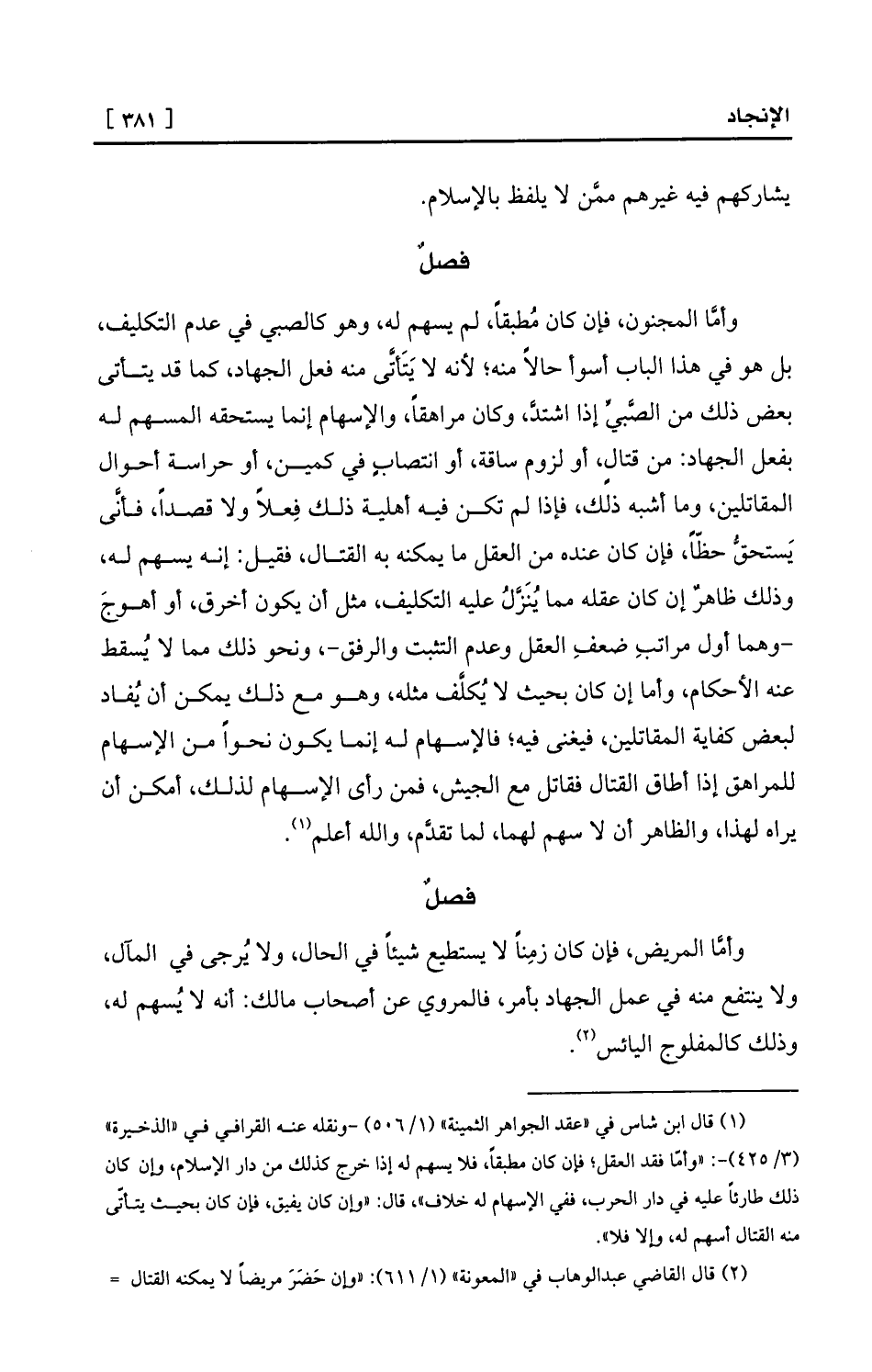 (¬1) قال ابن شاس في «عقد الجواهر الثمينة» (1/506) -ونقله عنه القرافي في «الذخيرة» (3/425) -: «وأمّا فقد العقل؛ فإن كان مطبقاً، فلا يسهم له إذا خرج كذلك من دار الإسلام، وإن كان ذلك طارئاً عليه في دار الحرب، ففي الإسهام له خلاف» ، قال: «وإن كان يفيق، فإن كان بحيث يتأتّى منه القتال أسهم له، وإلا فلا» .