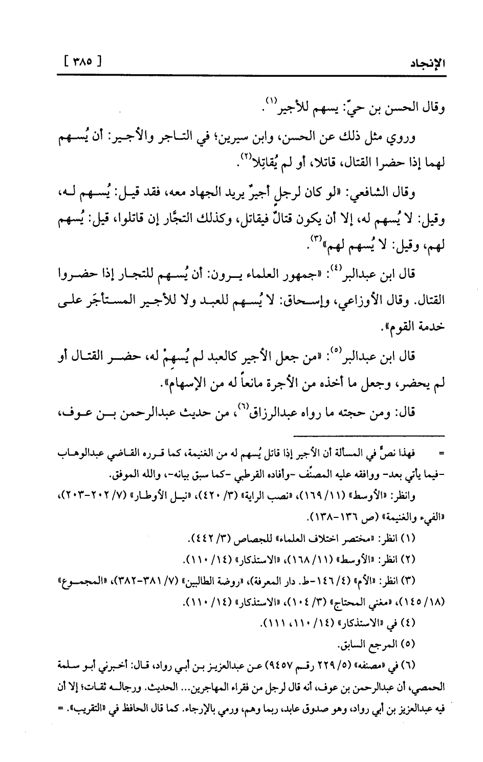 قال ابن عبد البر (¬5) : «من جعل الأجير كالعبد لم يُسهِمْ له، حضر القتال أو لم يحضر، وجعل ما أخذه من الأجرة مانعاً له من الإسهام» .