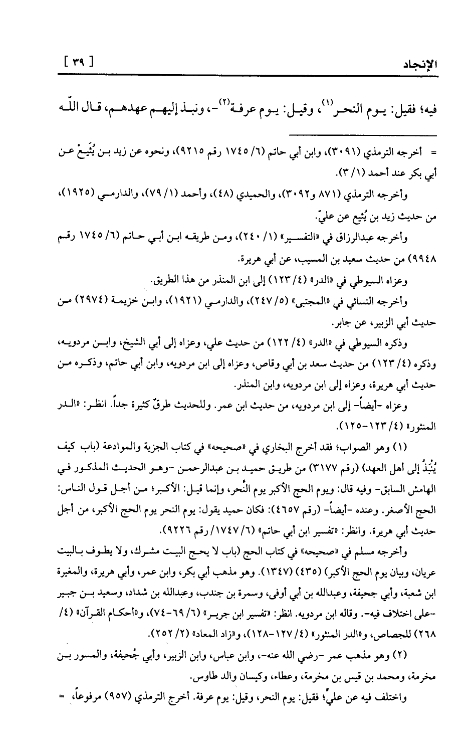 (¬1) وهو الصواب؛ فقد أخرج البخاري في «صحيحه» في كتاب الجزية والموادعة (باب كيف يُنْبَذُ إلى أهل العهد) (رقم 3177) من طريق حميد بن عبد الرحمن -وهو الحديث المذكور في الهامش السابق- وفيه قال: ويوم الحج الأكبر يوم النَّحر، وإنما قيل: الأكبر؛ من أجل قول الناس: الحج الأصغر. وعنده -أيضاً- (رقم 4657) : فكان حميد يقول: يوم النحر يوم الحج الأكبر، من أجل حديث أبي هريرة. وانظر: «تفسير ابن أبي حاتم» (6/1747/رقم 9226) .