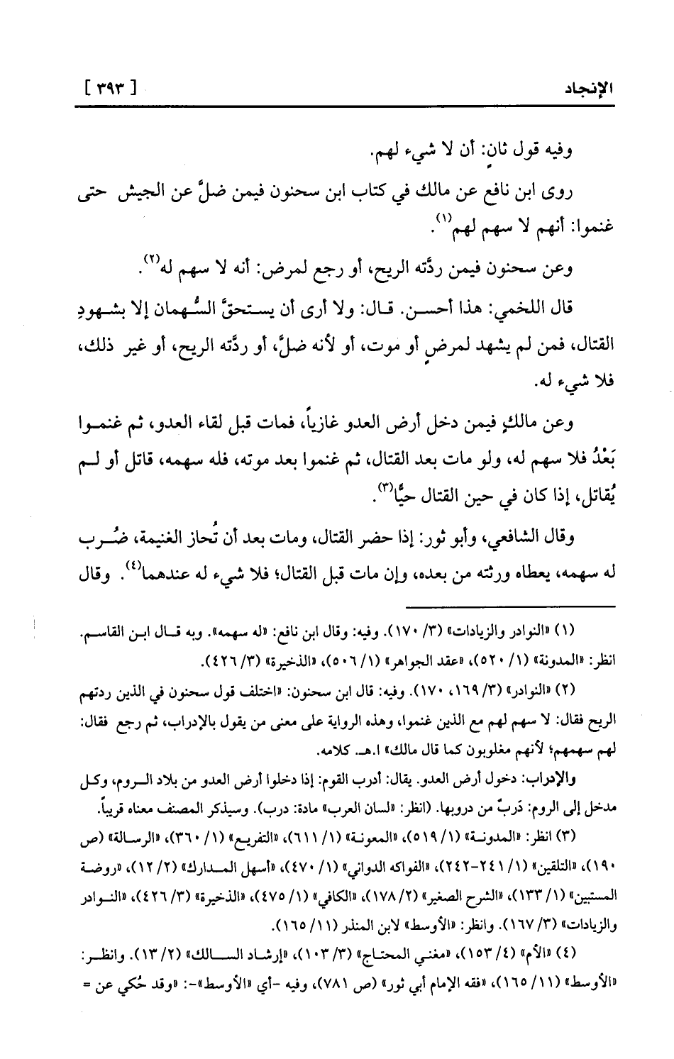(¬1) «النوادر والزيادات» (3/170) . وفيه: وقال ابن نافع: «له سهمه» . وبه قال ابن القاسم. انظر: «المدونة» (1/520) ، «عقد الجواهر» (1/506) ، «الذخيرة» (3/426) .