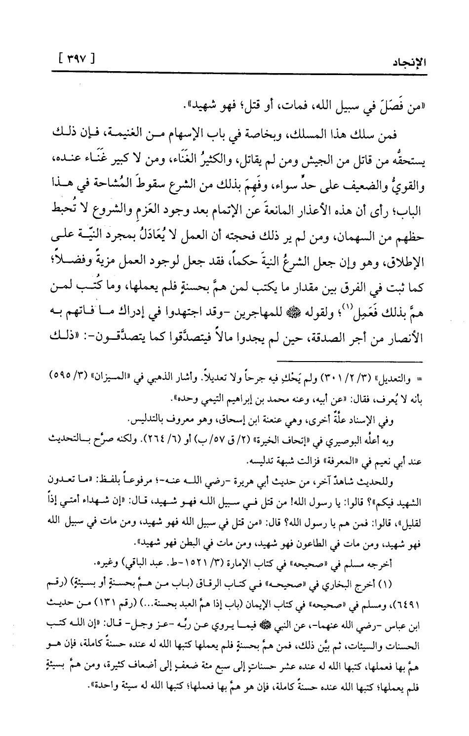 المانعةَ عن الإتمام بعد وجود العَزمِ والشروع لا تُحبط حظهم من السهمان، ومن لم ير ذلك فحجته أن العمل لا يُعَادَلُ بمجرد النيّة على الإطلاق، وهو وإن جعل الشرعُ النيةَ حكماً، فقد جعل لوجود العمل مزيةً وفضلاً؛ كما ثبت في الفرق بين مقدار ما يكتب لمن همَّ بحسنةٍ فلم يعملها، وما كُتب لمن همَّ بذلك فَعَمِل (¬1) ؛ ولقوله - صلى الله عليه وسلم - للمهاجرين -وقد اجتهدوا في إدراك ما فاتهم به الأنصار من أجر الصدقة، حين لم يجدوا مالاً فيتصدَّقوا كما يتصدَّقون-: «ذلك