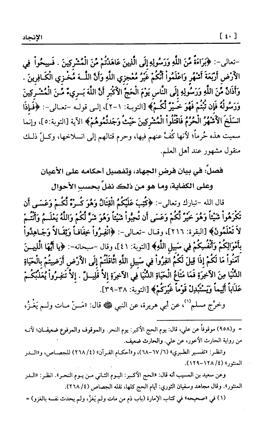 قال الله -تبارك وتعالى-: {كُتِبَ عَلَيْكُمُ الْقِتَالُ وَهُوَ كُرْهٌ لَّكُمْ وَعَسَى أَن تَكْرَهُواْ شَيْئاً وَهُوَ خَيْرٌ لَّكُمْ وَعَسَى أَن تُحِبُّواْ شَيْئاً وَهُوَ شَرٌّ لَّكُمْ وَاللَّهُ يَعْلَمُ وَأَنْتُمْ لاَ تَعْلَمُونَ} [البقرة: 216] ، وقال -تعالى-: {انْفِرُواْ خِفَافاً وَثِقَالاً وَجَاهِدُواْ بِأَمْوَالِكُمْ وَأَنْفُسِكُمْ فِي سَبِيلِ اللَّهِ} [التوبة: 41] ، وقال -سبحانه-: {يا أَيُّهَا الَّذِينَ آمَنُواْ مَا لَكُمْ إِذَا قِيلَ لَكُمُ انفِرُواْ فِي سَبِيلِ اللَّهِ اثَّاقَلْتُمْ إِلَى الأَرْضِ أَرَضِيتُمْ بِالْحَيَاةِ الدُّنْيَا مِنَ الآخِرَةِ فَمَا مَتَاعُ الْحَيَاةِ الدُّنْيَا فِي الآخِرَةِ إِلاَّ قَلِيلٌ. إِلاَّ تَنفِرُواْ يُعَذِّبْكُمْ عَذَاباً أَلِيماً وَيَسْتَبْدِلْ قَوْماً غَيْرَكُمْ} [التوبة: 38-39] .