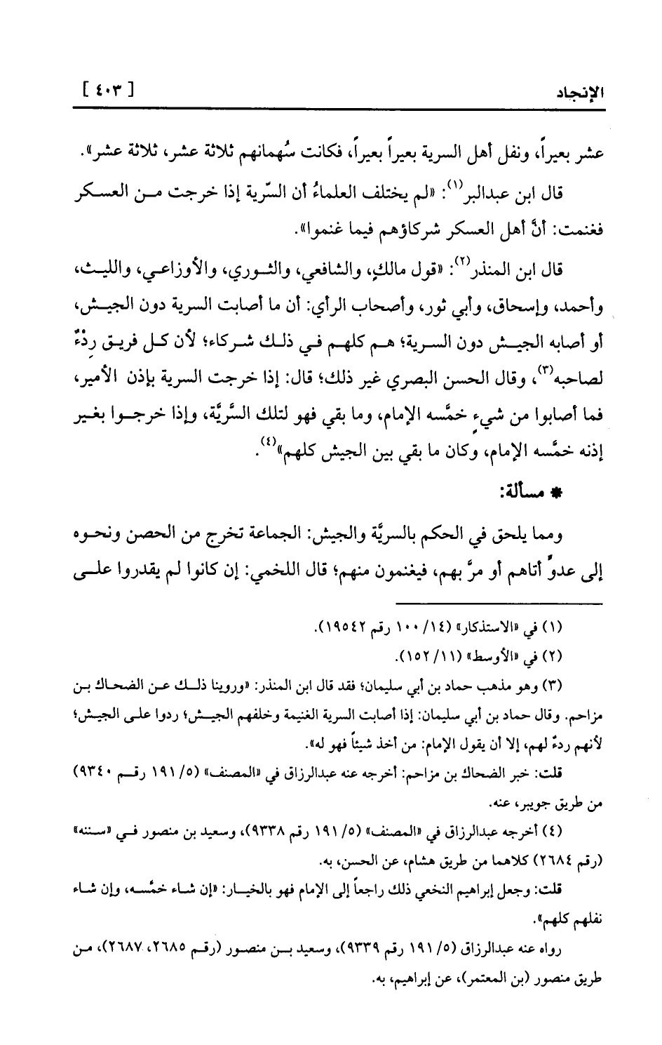 (¬3) وهو مذهب حماد بن أبي سليمان؛ فقد قال ابن المنذر: «وروينا ذلك عن الضحاك بن مزاحم. وقال حماد بن أبي سليمان: إذا أصابت السرية الغنيمة وخلفهم الجيش؛ ردوا على الجيش؛ لأنهم ردءٌ لهم، إلا أن يقول الإمام: من أخذ شيئاً فهو له» .