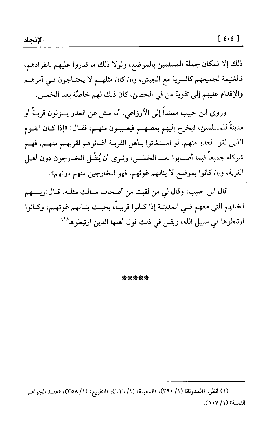 وروى ابن حبيب مسنداً إلى الأوزاعي، أنه سئل عن العدو ينزلون قريةً أو مدينةً للمسلمين، فيخرج إليهم بعضهم فيصيبون منهم، فقال: «إذا كان القوم الذين لقوا العدو منهم، لو استغاثوا بأهل القرية أغاثوهم لقربهم منهم، فهم شركاء جميعاً فيما أصابوا بعد الخمس، ونَرى أن يُنفَّل الخارجون دون أهل القرية، وإن كانوا بموضع لا ينالهم غوثهم، فهو للخارجين منهم دونهم» .