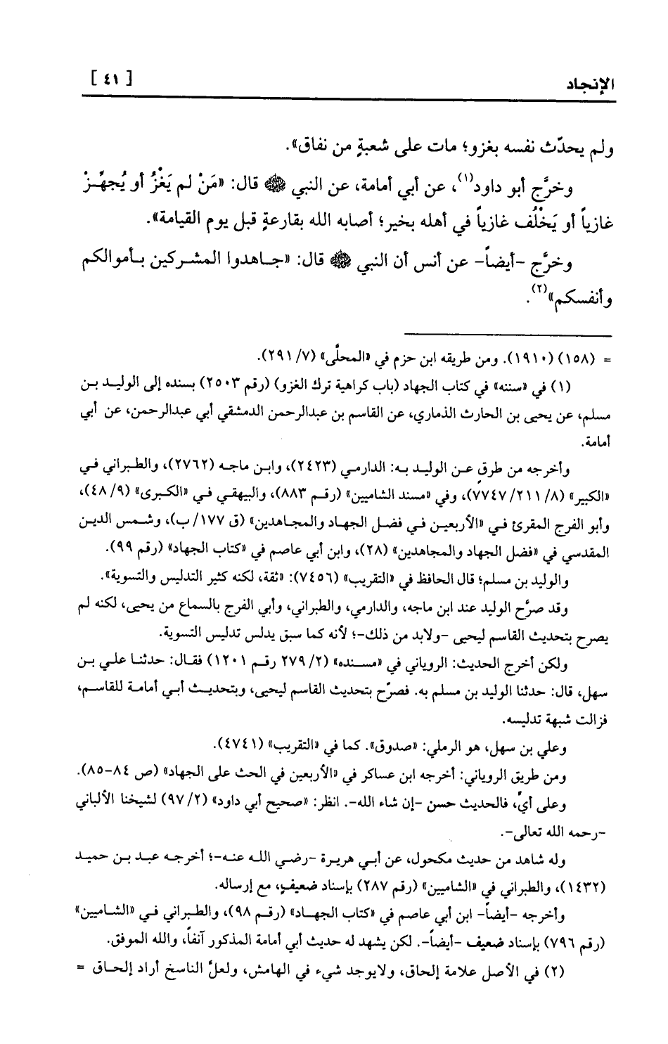 (¬1) في «سننه» في كتاب الجهاد (باب كراهية ترك الغزو) (رقم 2503) بسنده إلى الوليد بن مسلم، عن يحيى بن الحارث الذماري، عن القاسم بن عبد الرحمن الدمشقي أبي عبد الرحمن، عن أبي أمامة.