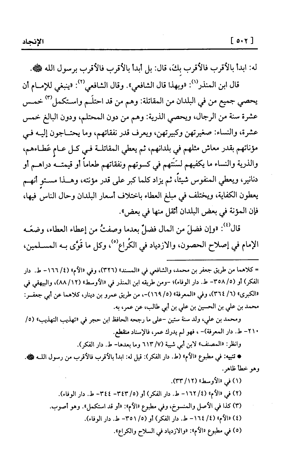 قال ابن المنذر (¬1) : «وبهذا قال الشافعي» . وقال الشافعي (¬2) : «ينبغي للإمام أن يحصي جميع من في البلدان من المقاتلة: وهم من قد احتلَم واستكمل (¬3) خمس عشرة سنة من الرجال، ويحصي الذرية: وهم من دون المحتلم، ودون البالغ خمس عشرة، والنساء: صغيرتهن وكبيرتهن، ويعرف قدر نفقاتهم، وما يحتاجون إليه في مؤناتهم بقدر معاش مثلهم في بلدانهم، ثم يعطي المقاتلة في كل عامٍ عَطاءهم، والذرية والنساء ما يكفيهم لسَنَتهم في كسوتهم ونفقاتهم طعاماً أو قيمته دراهم أو دنانير، ويعطي المنفوس شيئاً، ثم يزاد كلما كبر على قدر مؤنته، وهذا مستوٍ أنهم يعطون الكفاية، ويختلف في مبلغ العطاء باختلاف أسعار البلدان وحال الناس فيها، فإن المؤنة في بعض البلدان أثقل منها في بعض» .