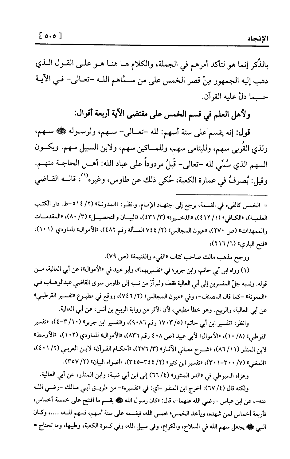 ولكنه قال (4/67) : أخرج ابن المنذر -أي: في «تفسيره» - من طريق أبي مالك -رضي الله عنه-، عن ابن عباس -رضي الله عنهما-، قال: «كان رسول الله - صلى الله عليه وسلم - يقسم ما افتتح على خمسة أخماس، فأربعة أخماس لمن شهده، ويأخذ الخمس؛ خمس الله، فيقسمه على ستة أسهم، فسهم لله،....، وكان النبي - صلى الله عليه وسلم - يجعل سهم الله في السلاح، والكراع، وفي سبيل الله، وفي كسوة الكعبة، وطيبها، وما تحتاج =
