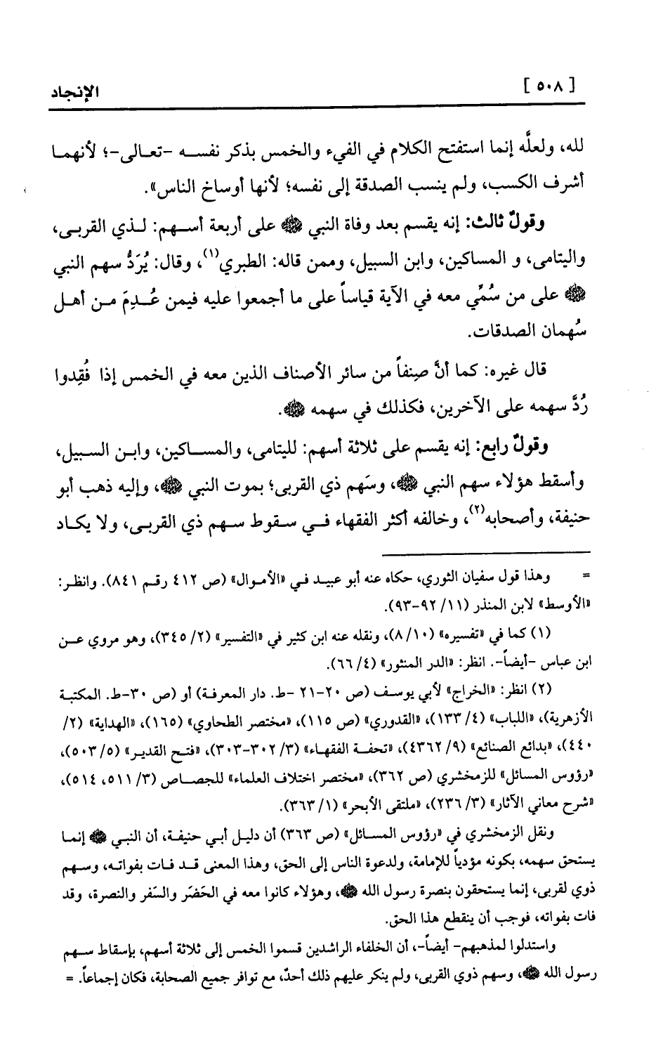 وقولٌ رابع: إنه يقسم على ثلاثة أسهم: لليتامى، والمساكين، وابن السبيل، وأسقط هؤلاء سهم النبي - صلى الله عليه وسلم -، وسَهم ذي القربى؛ بموت النبي - صلى الله عليه وسلم -، وإليه ذهب أبو حنيفة، وأصحابه (¬2) ، وخالفه أكثر الفقهاء في سقوط سهم ذي القربى، ولا يكاد