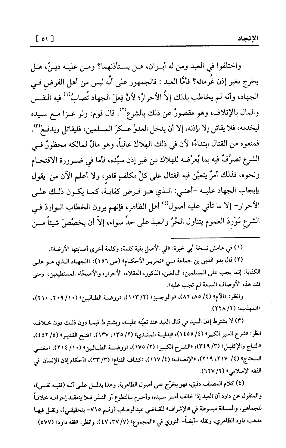 (¬3) لا يشترط إذن السيد في قتال العبد عند تعيّنه عليه، ويشترط فيما دون ذلك دون خلاف، انظر: «شرح السير الكبير» (4/1455) ، «بداية المبتدي» (2/135، 137) ، «فتح القدير» (5/442) ، «التاج والإكليل» (3/349) ، «الشرح الكبير» (2/175) ، «روضة الطالبين» (10/214) ، «مغني المحتاج» (4/ 217، 219) ، «الإنصاف» (4/117) ، «كشاف القناع» (3/33) ، «أحكام إذن الإنسان في الفقه الإسلامي» (2/627) .