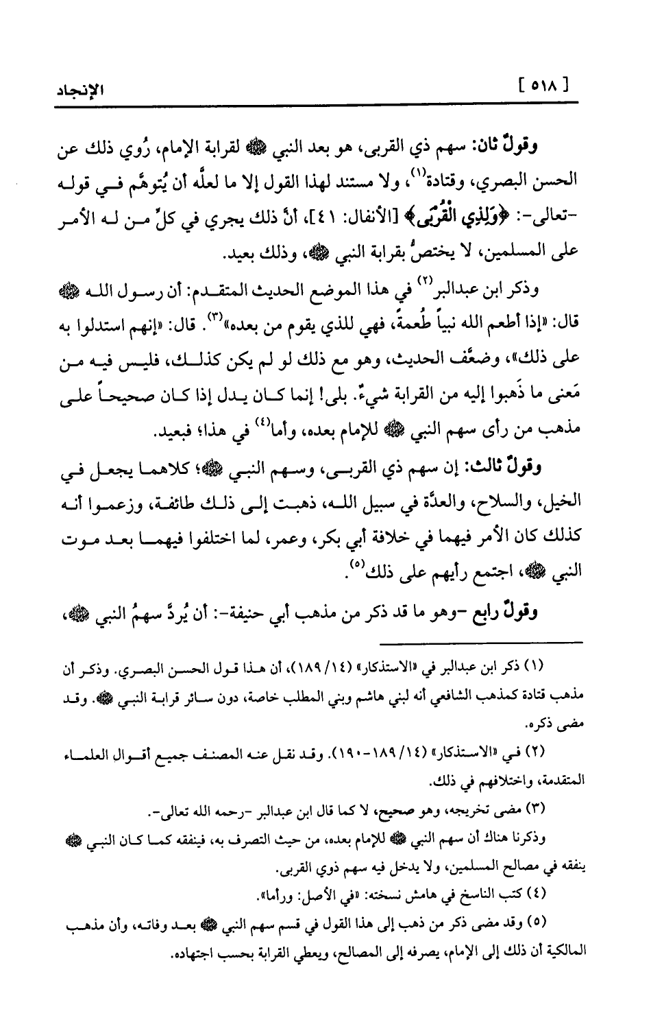 (¬5) وقد مضى ذكر من ذهب إلى هذا القول في قسم سهم النبي - صلى الله عليه وسلم - بعد وفاته، وأن مذهب المالكية أن ذلك إلى الإمام، يصرفه إلى المصالح، ويعطي القرابة بحسب اجتهاده.