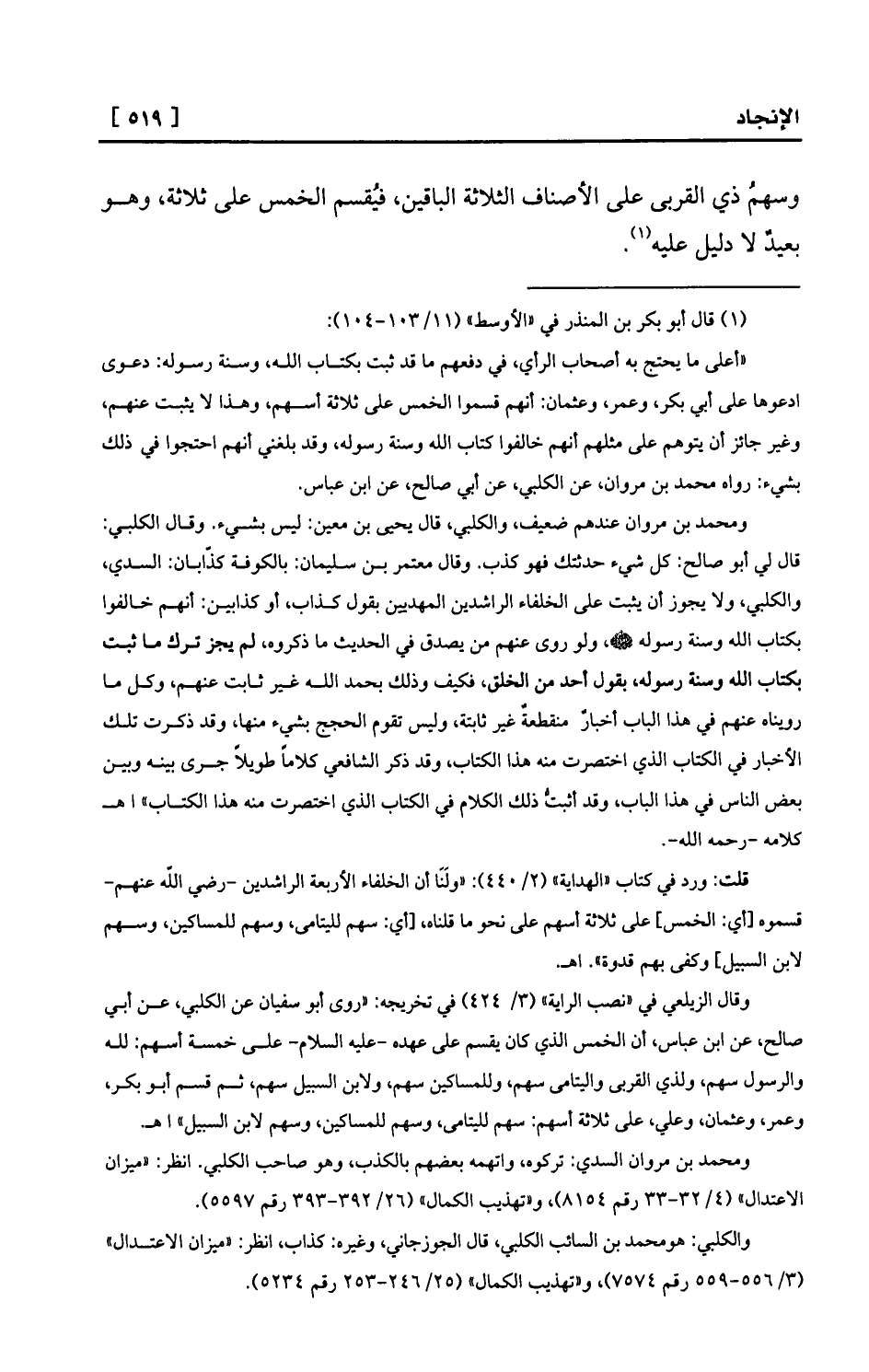 «أعلى ما يحتج به أصحاب الرأي، في دفعهم ما قد ثبت بكتاب الله، وسنة رسوله: دعوى ادعوها على أبي بكر، وعمر، وعثمان: أنهم قسموا الخمس على ثلاثة أسهم، وهذا لا يثبت عنهم، وغير جائز أن يتوهم على مثلهم أنهم خالفوا كتاب الله وسنة رسوله، وقد بلغني أنهم احتجوا في ذلك بشيء: رواه محمد بن مروان، عن الكلبي، عن أبي صالح، عن ابن عباس.