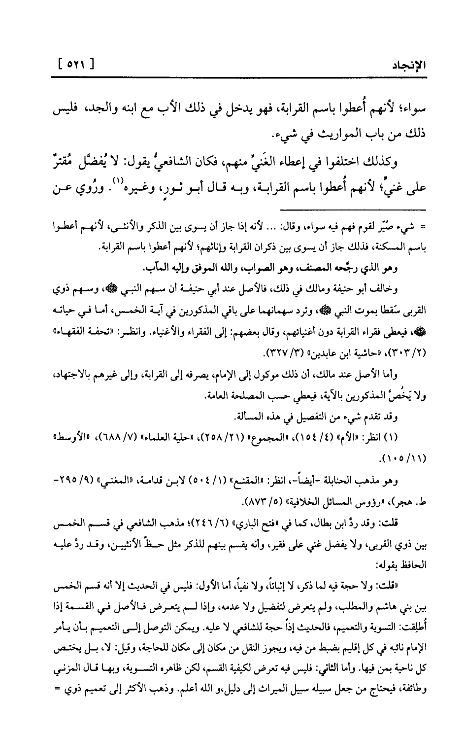 «قلت: ولا حجة فيه لما ذكر، لا إثباتاً، ولا نفياً، أما الأول: فليس في الحديث إلا أنه قسم الخمس بين بني هاشم والمطلب، ولم يتعرض لتفضيل ولا عدمه، وإذا لم يتعرض فالأصل في القسمة إذا أُطلِقت: التسوية والتعميم، فالحديث إذاً حجة للشافعي لا عليه. ويمكن التوصل إلى التعميم بأن يأمر الإمام نائبه في كل إقليم بضبط من فيه، ويجوز النقل من مكان إلى مكان للحاجة، وقيل: لا، بل يختص كل ناحية بمن فيها. وأما الثاني: فليس فيه تعرض لكيفية القسم، لكن ظاهره التسوية، وبها قال المزني وطائفة، فيحتاج من جعل سبيله سبيل الميراث إلى دليل، والله أعلم. وذهب الأكثر إلى تعميم ذوي =