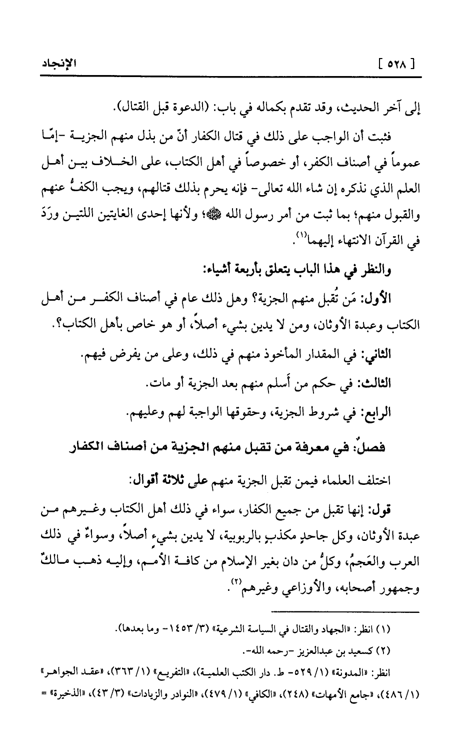 فثبت أن الواجب على ذلك في قتال الكفار أنّ من بذل منهم الجزية -إمّا عموماً في أصناف الكفر، أو خصوصاً في أهل الكتاب، على الخلاف بين أهل العلم الذي نذكره إن شاء الله تعالى- فإنه يحرم بذلك قتالهم، ويجب الكفُّ عنهم والقبول منهم؛ بما ثبت من أمر رسول الله - صلى الله عليه وسلم -؛ ولأنها إحدى الغايتين اللتين ورَدَ في القرآن الانتهاء إليهما (¬1) .