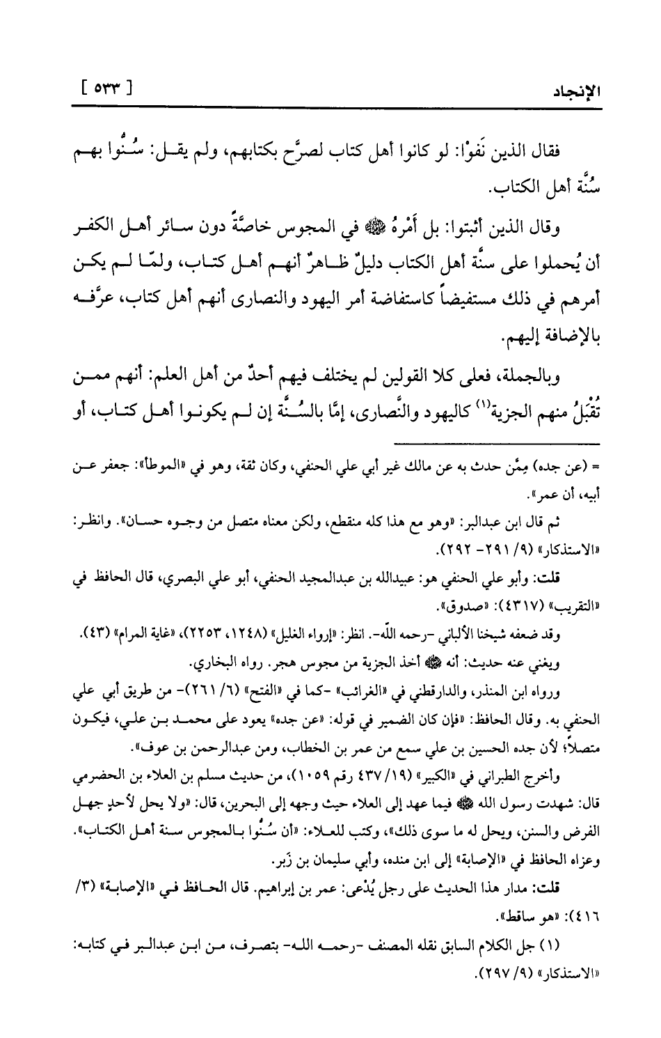 وقال الذين أثبتوا: بل أَمْرهُ - صلى الله عليه وسلم - في المجوس خاصَّةً دون سائر أهل الكفر أن يُحملوا على سنَّة أهل الكتاب دليلٌ ظاهرٌ أنهم أهل كتاب، ولمّا لم يكن أمرهم في ذلك مستفيضاً كاستفاضة أمر اليهود والنصارى أنهم أهل كتاب، عرَّفه بالإضافة إليهم.