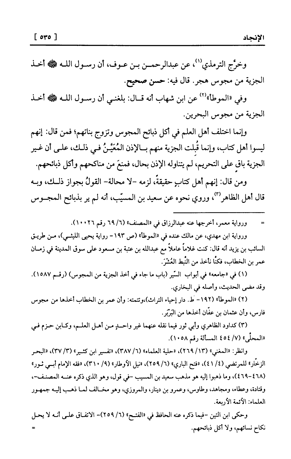 (¬2) «الموطأ» (192- ط. دار إحياء التراث) ، وتتمته: وأن عمر بن الخطاب أخذها من مجوس فارس، وأن عثمان بن عفّان أخذها من البَرْبَر.