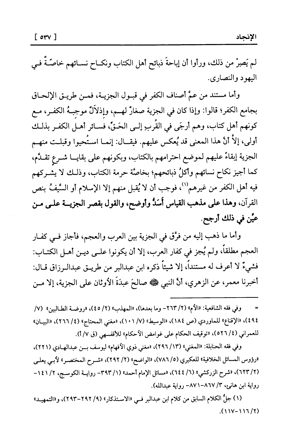 وأما مستند من عمَّ أصناف الكفر في قبول الجزية، فمن طريق الإلحاق بجامع الكفر؛ قالوا: وإذا كان في الجزية صغارٌ لهم، وإِذلاَلٌ موجِبهُ الكفر، مع كونهم أهل كتاب، وهم أرجَى في القُربِ إلى الحَقِّ، فسائر أهل الكفر بذلك أولى، إلاَّ أنَّ هذا المعنى قد يُعكس عليهم. فيقال: إنما استُحيوا وقبلت منهم الجزية إبقاءً عليهم لموضع احترامهم بالكتاب، وبكونهم على بقايا شرعٍ تقدَّم، كما أجيز نكاح نسائهم وأكلُ ذبائحهم؛ بخاصَّة حرمة الكتاب، وذلك لا يشركهم فيه أهل الكفر من غيرهم (¬1) ، فوجب أن لا يُقبل منهم إلا الإسلام أو السَّيفُ بنص القرآن، وهذا على مذهب القياس أَسَدُّ وأوضح، والقول بقصر الجزية على من عيِّن في ذلك أرجح.