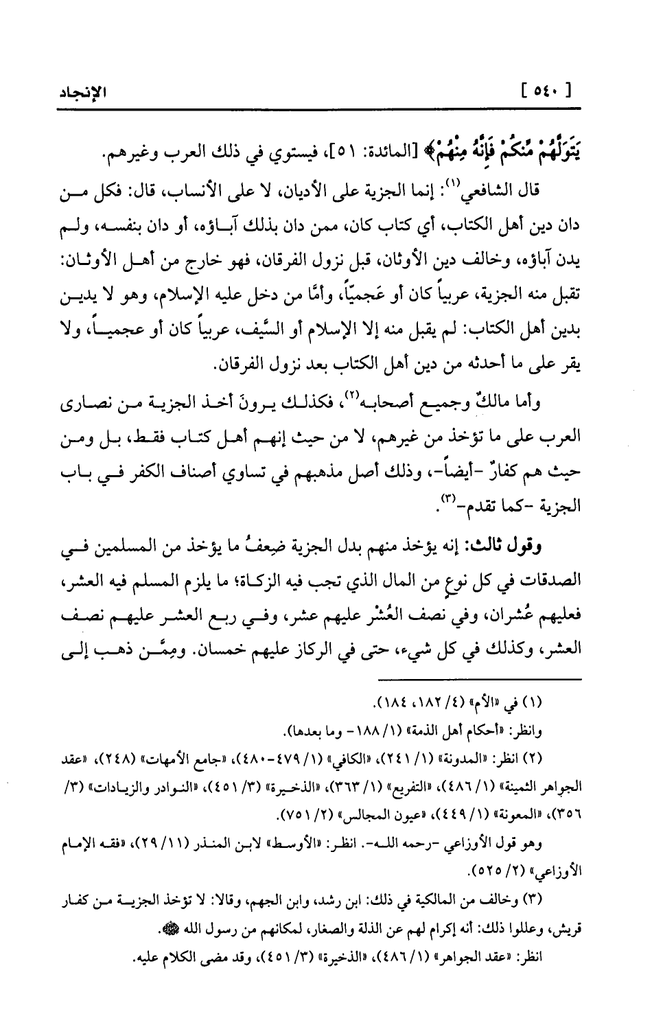 وأما مالكٌ وجميع أصحابه (¬2) ، فكذلك يرونَ أخذ الجزية من نصارى العرب على ما تؤخذ من غيرهم، لا من حيث إنهم أهل كتاب فقط، بل ومن حيث هم كفارٌ -أيضاً-، وذلك أصل مذهبهم في تساوي أصناف الكفر في باب الجزية -كما تقدم- (¬3) .