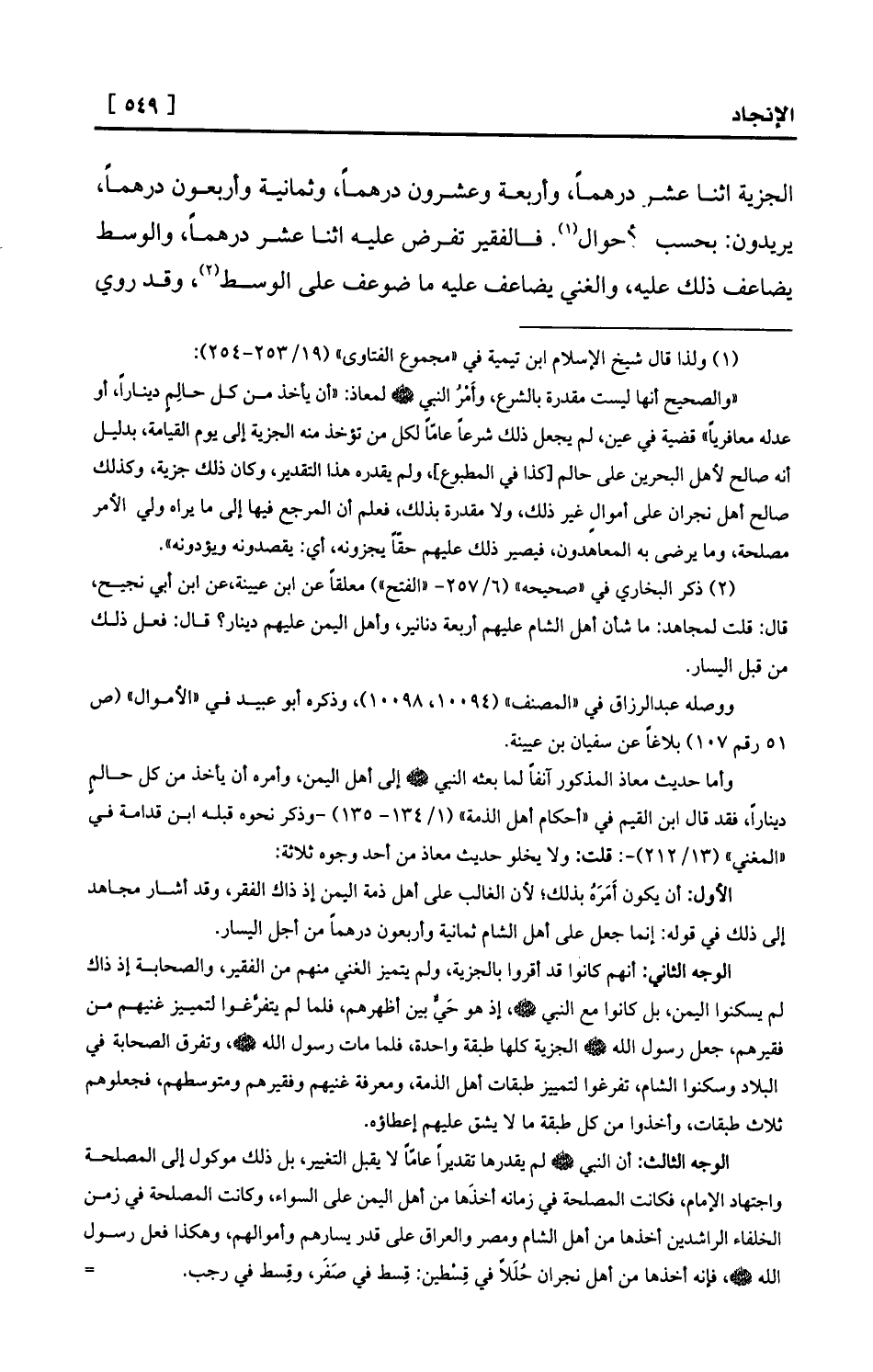 الوجه الثالث: أن النبي - صلى الله عليه وسلم - لم يقدرها تقديراً عامّاً لا يقبل التغيير، بل ذلك موكول إلى المصلحة واجتهاد الإمام، فكانت المصلحة في زمانه أخذَها من أهل اليمن على السواء، وكانت المصلحة في زمن الخلفاء الراشدين أخذها من أهل الشام ومصر والعراق على قدر يسارهم وأموالهم، وهكذا فعل رسول الله - صلى الله عليه وسلم -، فإنه أخذها من أهل نجران حُلَلاً في قِسْطين: قِسطٌ في صَفَر، وقِسطٌ في رجب. =