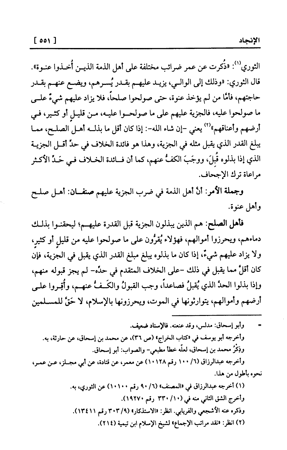 الثوري (¬1) : «ذُكرت عن عمر ضرائب مختلفة على أهل الذمة الذين أُخذوا عنوة» . قال الثوري: «وذلك إلى الوالي، يزيد عليهم بقدر يُسرهم، ويضع عنهم بقدر حاجتهم، فأمَّا من لم يؤخذ عنوة، حتى صولحوا صلحاً،