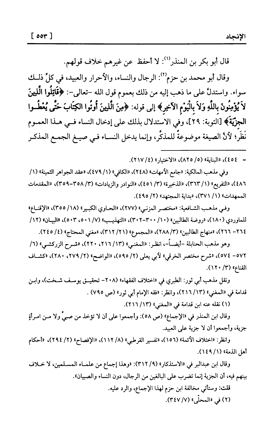 وقال أبو محمد بن حزم (¬2) : الرجال والنساء، والأحرار والعبيد، في كلِّ ذلك سواء. واستدلَّ على ما ذهب إليه من ذلك بعموم قول الله -تعالى-: {قَاتِلُوا الَّذِينَ لاَ يُؤْمِنُونَ بِاللَّهِ وَلاَ بِالْيَوْمِ الآخِرِ} إلى قوله: {مِنَ الَّذِينَ أُوتُوا الكِتَابَ حَتَّى يُعْطُوا الجِزْيَةَ} [التوبة: 29] ، وفي الاستدلال بذلك على إدخال النساء في هذا العموم نَظَر؛ لأنَّ الصيغة موضوعةٌ للمذكَّر، وإنما يدخل النساء في صيغ الجمع المذكر