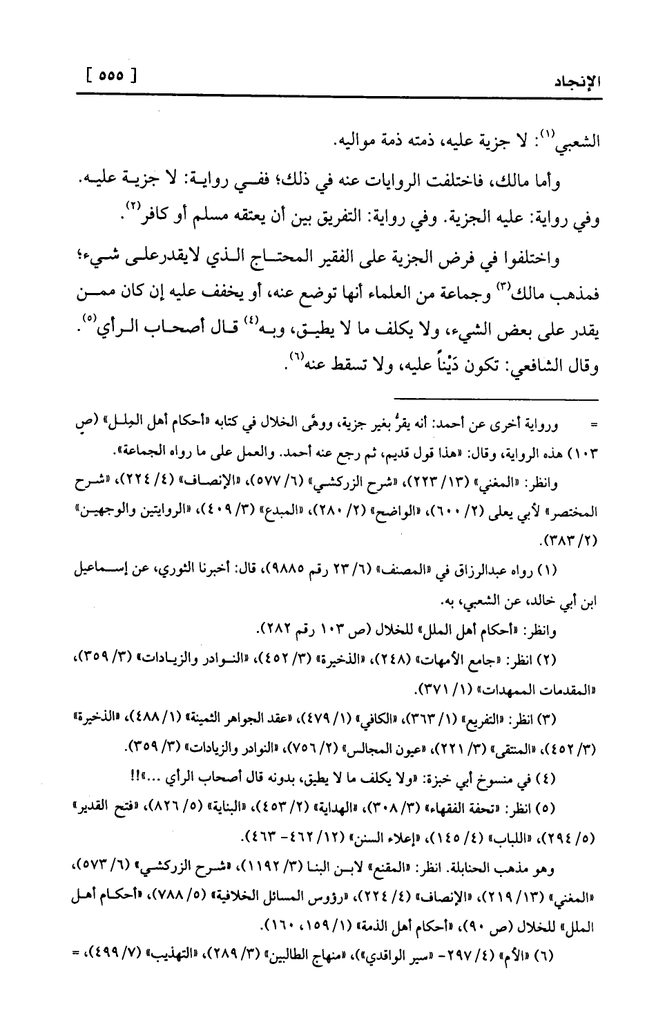 = ورواية أخرى عن أحمد: أنه يقرُّ بغير جزية، ووهَّى الخلال في كتابه «أحكام أهل المِلل» (ص 103) هذه الرواية، وقال: «هذا قول قديم، ثم رجع عنه أحمد. والعمل على ما رواه الجماعة» .