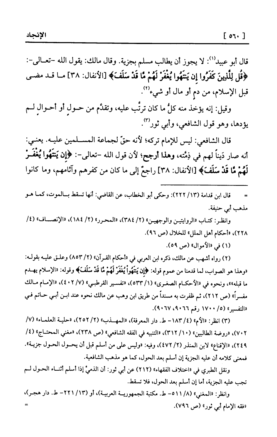 (¬3) انظر: «الأم» (4/183- ط. دار المعرفة) ، «المهذب» (2/252) ، «حلية العلماء» (7/ 702) ، «روضة الطالبين» (10/312) ، «التنبيه في الفقه الشافعي» (ص 238) ، «مغني المحتاج» (4/ 249) ، «الإقناع» لابن المنذر (2/472) ، وفيه: «وليس على من أسلم قبل أن يحول الحول جزية» . فمعنى كلامه أن عليه الجزية إن أسلم بعد الحول، كما هو مذهب الشافعية.