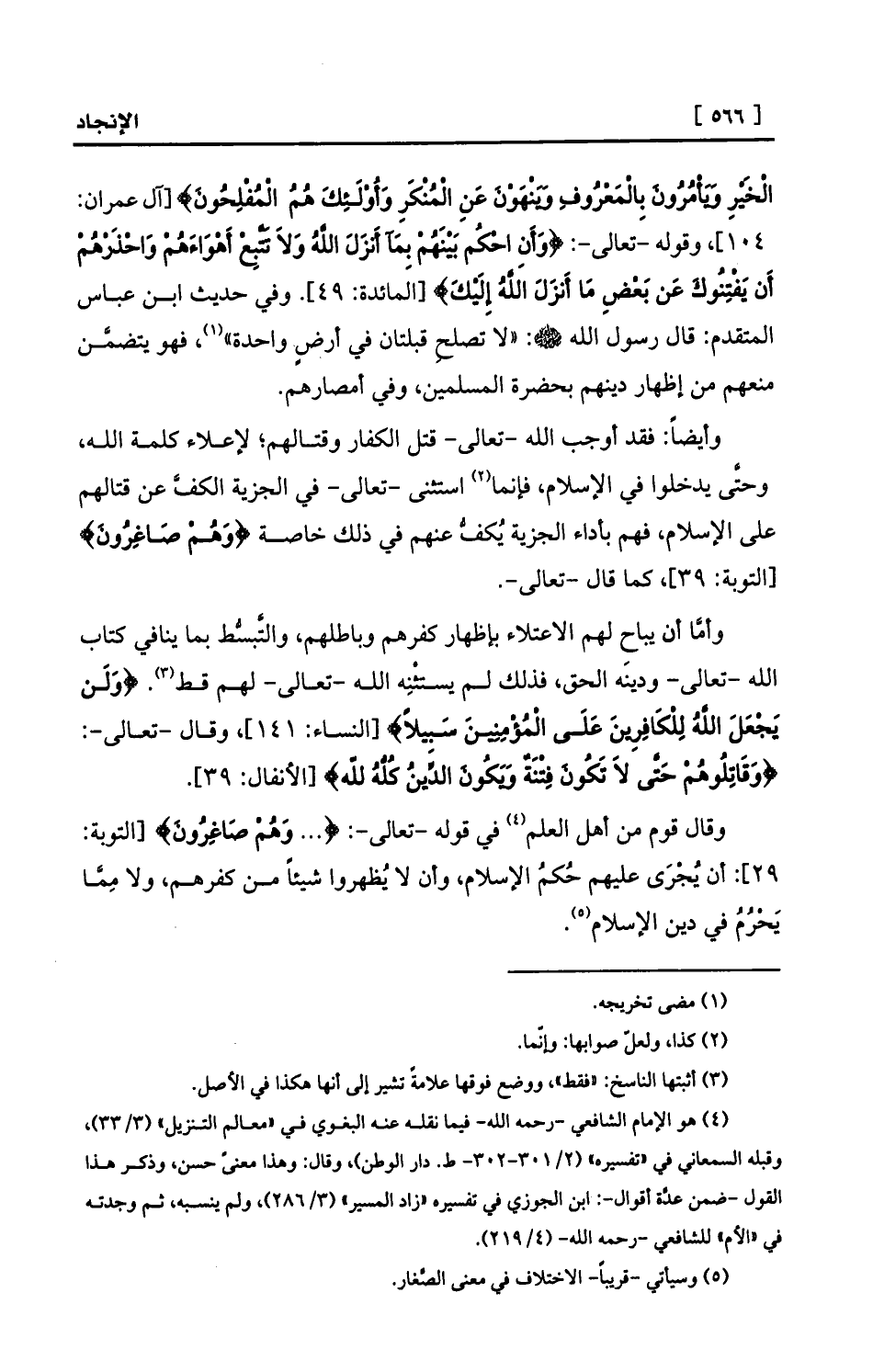 الْخَيْرِ وَيَأْمُرُونَ بِالْمَعْرُوفِ وَيَنْهَوْنَ عَنِ الْمُنْكَرِ وَأُوْلَئِكَ هُمُ الْمُفْلِحُونَ} [آل عمران: 104] ، وقوله -تعالى-: {وَأَنِ احْكُم بَيْنَهُمْ بِمَآ أَنزَلَ اللَّهُ وَلاَ تَتَّبِعْ أَهْوَاءَهُمْ وَاحْذَرْهُمْ أَن يَفْتِنُوكَ عَن بَعْضِ مَا أَنزَلَ اللَّهُ إِلَيْكَ} [المائدة: 49] . وفي حديث ابن عباس المتقدم: قال رسول الله - صلى الله عليه وسلم -: «لا تصلحِ قبلتان في أرضٍ واحدة» (¬1) ، فهو يتضمَّن منعهم من إظهار دينهم بحضرة المسلمين، وفي أمصارهم.