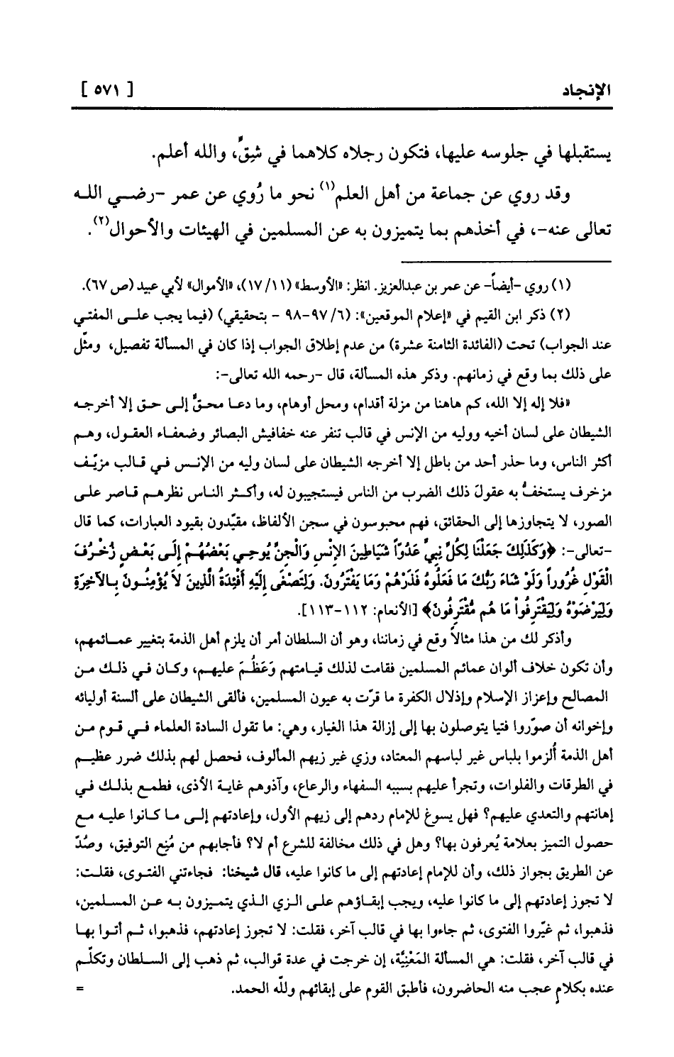 (¬2) ذكر ابن القيم في «إعلام الموقعين» : (6/97-98 - بتحقيقي) (فيما يجب على المفتي عند الجواب) تحت (الفائدة الثامنة عشرة) من عدم إطلاق الجواب إذا كان في المسألة تفصيل، ومثّل على ذلك بما وقع في زمانهم. وذكر هذه المسألة، قال -رحمه الله تعالى-: