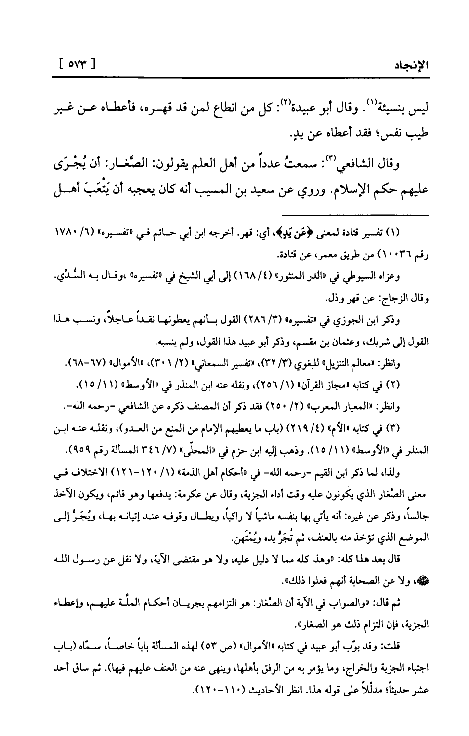 قلت: وقد بوّب أبو عبيد في كتابه «الأموال» (ص 53) لهذه المسألة باباً خاصاً، سمّاه (باب اجتباء الجزية والخراج، وما يؤمر به من الرفق بأهلها، وينهى عنه من العنف عليهم فيها) . ثم ساق أحد عشر حديثاً؛ مدلِّلاً على قوله هذا. انظر الأحاديث (110-120) .