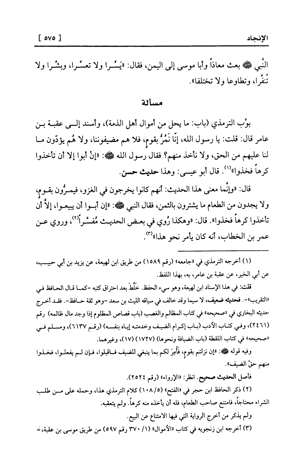 بوَّب الترمذي (باب: ما يحل من أموال أهل الذمة) ، وأسند إلى عقبة بن عامر قال: قلت: يا رسول الله، إنّا نَمُرُّ بقومٍ، فلا هم مضيفوننا، ولا هُم يؤدّون ما لنا عليهم من الحق، ولا نأخذ منهم؟ فقال رسول الله - صلى الله عليه وسلم -: «إنْ أبوا إلا أن تأخذوا كرهاً فخذوا» (¬1) . قال أبو عيسى: وهذا حديث حسن.