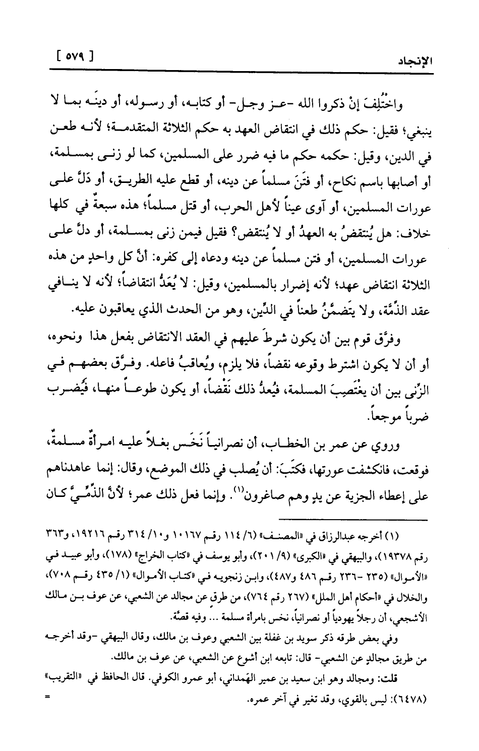 (¬1) أخرجه عبد الرزاق في «المصنف» (6/114 رقم 10167 و10/314 رقم 19216، و363 رقم 19378) ، والبيهقي في «الكبرى» (9/201) ، وأبو يوسف في «كتاب الخراج» (178) ، وأبو عبيد في «الأموال» (235 -236 رقم 486 و487) ، وابن زنجويه في «كتاب الأموال» (1/435 رقم 708) ، والخلال في «أحكام أهل الملل» (267 رقم 764) ، من طرقٍ عن مجالد عن الشعبي، عن عوف بن مالك الأشجعي، أن رجلاً يهودياً أو نصرانياً، نخس بامرأة مسلمة ... وفيه قصَّة.