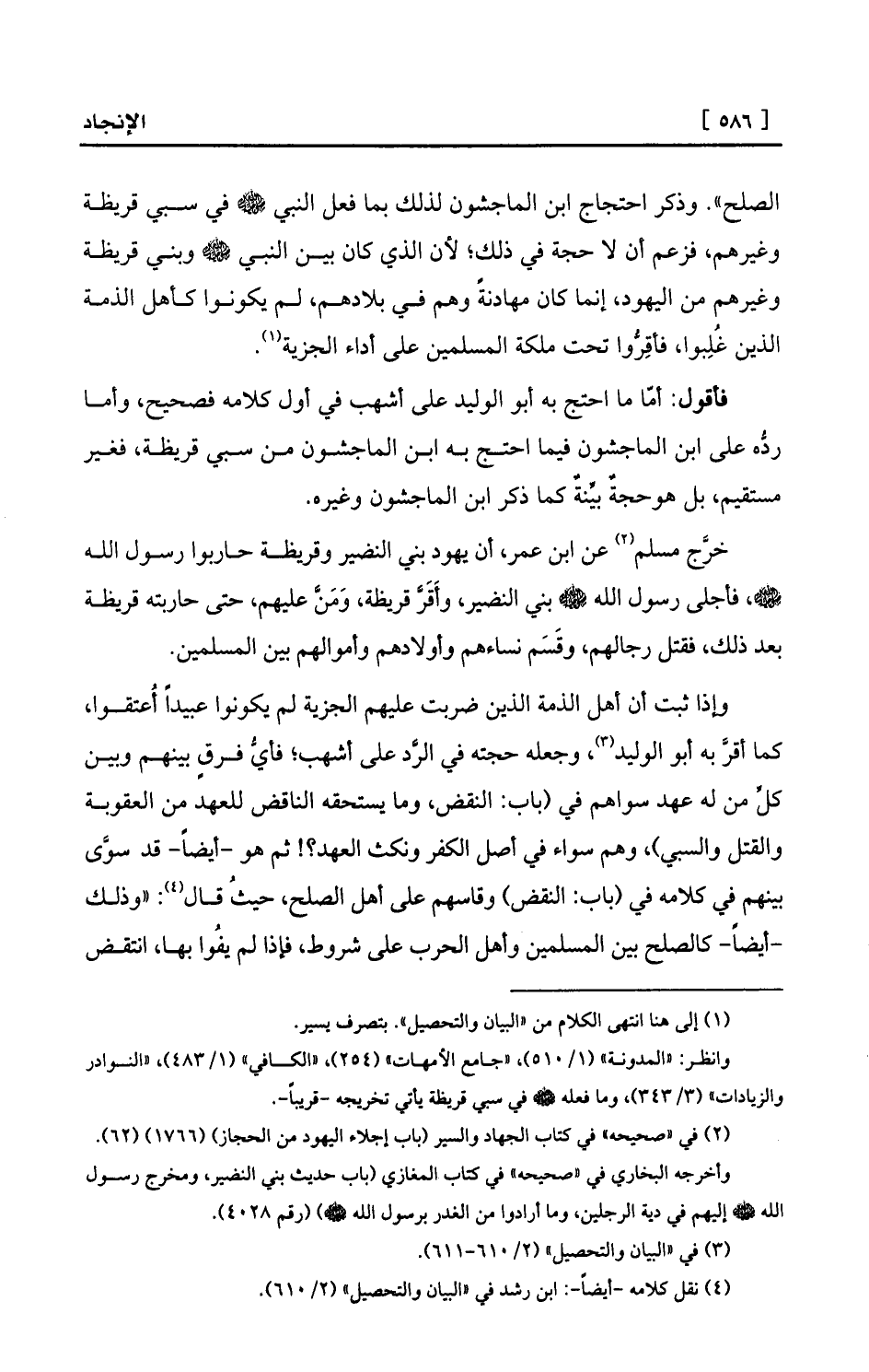 فأقول: أمّا ما احتج به أبو الوليد على أشهب في أول كلامه فصحيح، وأما ردُّه على ابن الماجشون فيما احتج به ابن الماجشون من سبي قريظة، فغير مستقيم، بل هوحجةٌ بيِّنةٌ كما ذكر ابن الماجشون وغيره.