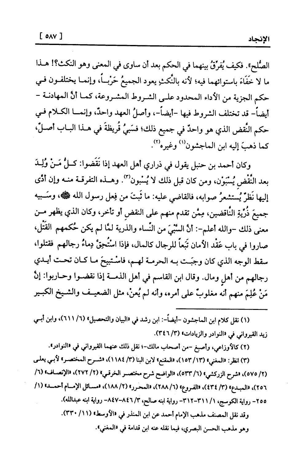 الصُّلح» . فكيف يُفرِّقُ بينهما في الحكم بعد أن ساوى في المعنى وهو النكث؟! هذا ما لا خَفَاءَ باستوائهما فيه؛ لأنه بالنَّكثِ يعود الجميعُ حَرْباً، وإنما يختلفون في حكم الجزية من الأداء المحدود على الشروط المشروعة، كما أنَّ المهادنة -أيضاً- قد تختلف الشروط فيها -أيضاً-، وأصلُ العهد واحدٌ، وإنما الكلام في حكم النَّقض الذي هو واحدٌ في جميع ذلك؛ فسَبيُ قُريظةَ في هذا الباب أصلٌ، كما ذهبَ إليه ابن الماجشون (¬1) وغيره (¬2) .