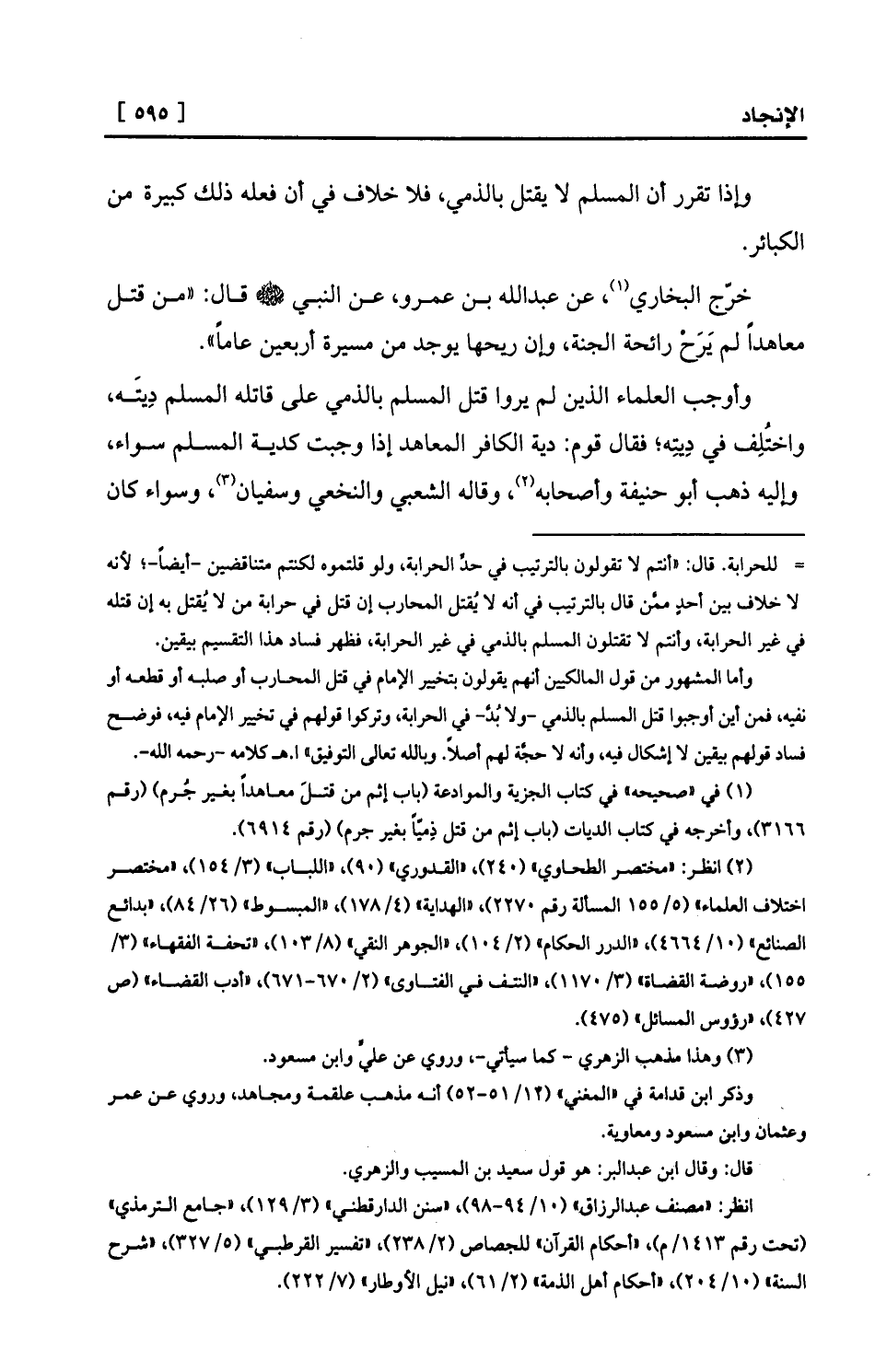 (¬1) في «صحيحه» في كتاب الجزية والموادعة (باب إثم من قتلَ معاهداً بغير جُرم) (رقم 3166) ، وأخرجه في كتاب الديات (باب إثم من قتل ذِميّاً بغير جرم) (رقم 6914) .