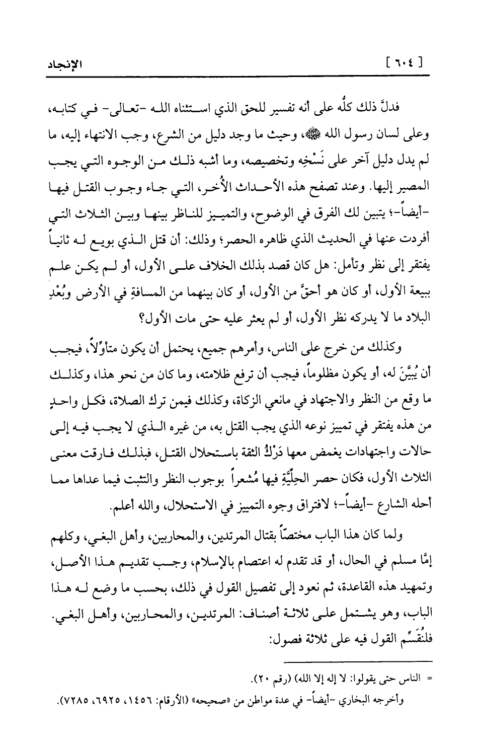 ولما كان هذا الباب مختصّاً بقتال المرتدين، والمحاربين، وأهل البغي، وكلهم إمَّا مسلم في الحال، أو قد تقدم له اعتصام بالإسلام، وجب تقديم هذا الأصل، وتمهيد هذه القاعدة، ثم نعود إلى تفصيل القول في ذلك، بحسب ما وضع له هذا الباب، وهو يشتمل على ثلاثة أصناف: المرتدين، والمحاربين، وأهل البغي. فلنُقَسِّم القول فيه على ثلاثة فصول: